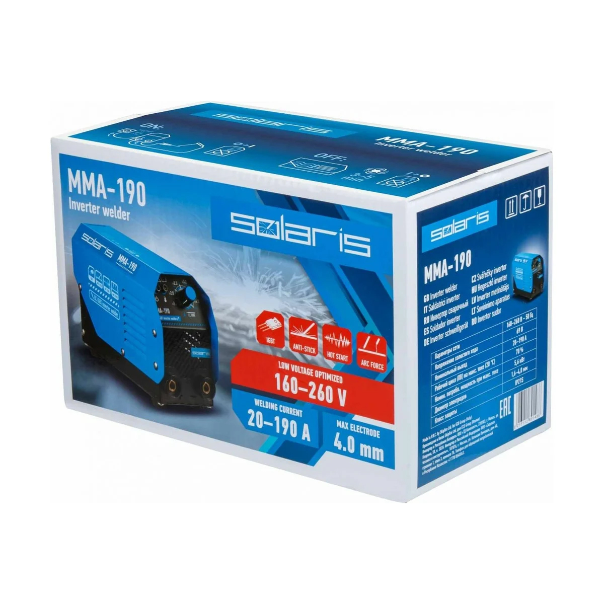 Инвертор сварочный SOLARIS MMA - 190 Сварочный аппарат инверторный SOLARIS MMA-190 предназначен для выполнения электросварочных работ в режиме ручной дуговой сварки ММА. Позволяет варить всеми типами штучных покрытых электродов: рутиловыми, базовыми, из нержавеющей стали и др. Переносной сварочный инвертор применяется для электросварки углеродистых сталей, чугуна, нержавеющей стали, меди и сплавов, а также других цветных металлов.Сварочник работает на базе 4 современных IGBT-транзисторов, отличается высокой надежностью и уверенной работой при входном напряжении от 160 В. Конструкция сварочного аппарата обеспечивает эффективное охлаждение компонентов. Двойная шкала позволяет легко настроить инвертор как новичку, так и профессионалу.Функция ArcForce обеспечивает стабильность горения дуги при малом расстоянии между электродом и деталью, что позволяет получить качественный сварочный шов. Функция AntiStick защищает от залипания электрода во время сварки. Функция HotStart позволяет легко зажечь дугу.Уровень питающей сети 160-260 В. Диапазон выходного тока MMA составляет 20 - 190 А. Применяются электроды диаметром от 1,6 мм до 4 мм. Максимальное напряжение холостого хода: 69 В. Рабочий цикл на максимальном токе – 40% при 40 °C и 70% при 20 °C. Прибор имеет защиту от перегрева и предназначен для работы от однофазной сети переменного тока с напряжением 230 В.Аппарат для сварки Солярис ММА 190 отличается компактными размерами и небольшим весом, что позволяет легко переносить его с места на место, перевозить в автомобиле. В комплект поставки входят держатель электродов, магнитная клемма заземления – масса, кабели сварочные медные длиной по 2 м, а также транспортировочный ремень.Электро сварочный аппарат инвертор SOLARIS MMA 190 – отличный выбор для тех, кто занимается строительными работами или нуждается в надежном инструменте для выполнения сварочных работ.Диапазон выходного тока MMA 20-190 АНапряжение холостого хода 69 ВДиаметр электродов MMA 1,6-4,0 ммНапряжение питающей сети 160 - 260 ВЧастота питающей сети 50 ГцТип сети однофазнаяНоминальный ток на входе 19,3 АМаксимальный допустимый ток на входе 30,6 АНоминальная потребляемая мощность при макс. токе 5,6 кВтРекомендуемая мощность генератора 6,5 кВАКПД 92 %Фактор мощности cos φ 0,82Масса (без принадлежностей) 3,4 кгМасса (с принадлежностями) 4,2 кгГабаритные размеры (ДхШхВ) 285х105х175 ммСетевая вилка входит в комплект поставки - вы сможете сразу работать с аппаратом после покупки!Комплектация :Сварочный аппарат инвертор;Электрододержатель с кабелем 2 м;Клемма заземления с кабелем 2 м; Ремень транспортировочный;Инструкция; Сетевая вилка;Коробка