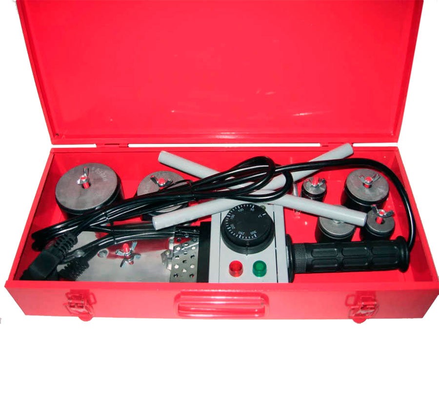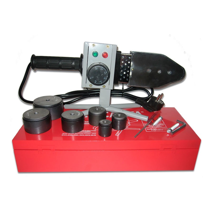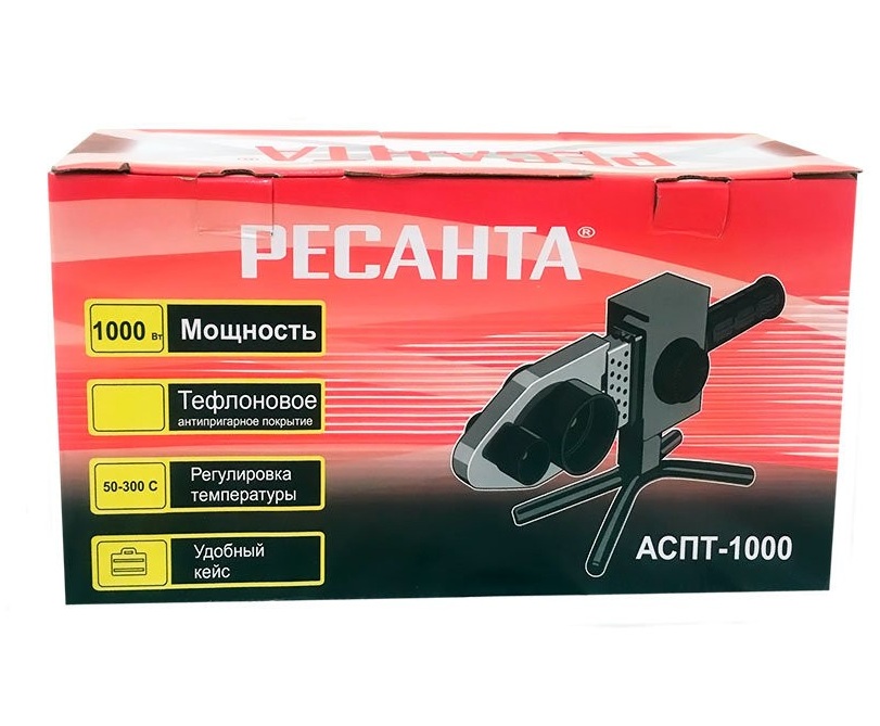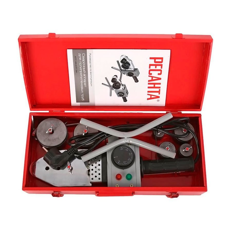 Сварочный паяльник для полипропиленовых труб РЕСАНТА АСПТ-1000 предназначен для ручной сварки в раструб полипропиленовых труб и фитингов небольших размеров. Обеспечивает надёжное диффузное соединение материала.Прибор используется для сварки труб различного диаметра из большинства полимерных материалов. Он надежно соединяет конструкции без протечек в месте шва. Сварка выполняется в месте стыка и не требует применения дополнительных деталей. Насадки имеют антипригарное тефлоновое покрытие, обеспечивающее долгий срок службы. Аппарат оснащен индикатором подключения к сети и контроля температуры. Также предусмотрена подставка, на которую можно установить прибор при перерывах в работе. Есть удобный и вместительный металлический кейс.Важно помнить:Отдельные узлы аппарата во время работы нагреваются.Устройство применяется только для сварки пластиковых труб в условиях отсутствия агрессивных газов.При подключении в электросеть используйте только розетки с заземлением – это поможет избежать электрического удара.Применение в промышленных объёмах, в условиях высокой интенсивности работ и сверхтяжёлых нагрузок, снижает срок службы аппарата.Комплектация:Сварочный аппарат: 1 штНасадки: 6 парПодставка под сварочный аппарат: 1 штРуководство по эксплуатации: 1 штКлюч имбусовый: 1 штКейс: 1 штХарактеристики:Тип: для сварки полипропиленовых трубТип сварки: раструбная (муфтовая)Тип сварочной насадки: электромуфтоваяТерморегулятор: даПитание: от электросетиМощность, Вт: 1000Рабочая температура, °C: 0 - 300Диаметр трубы, мм: 20 – 63Напряжение сети, В: 220Габариты, см: 41,5 х 22,7 х 15Вес: 4,85 кг