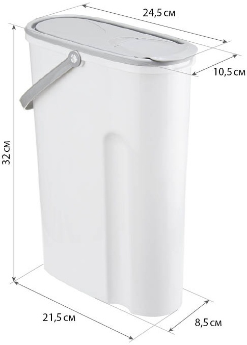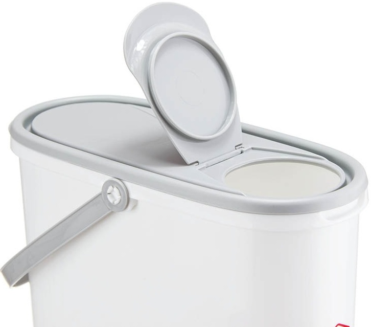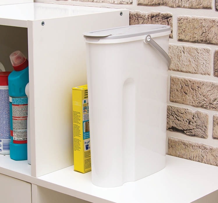 Оптимальный объем: Емкость 5 литров идеально вмещает стандартную среднюю пачку порошка (около 3–4 кг).
