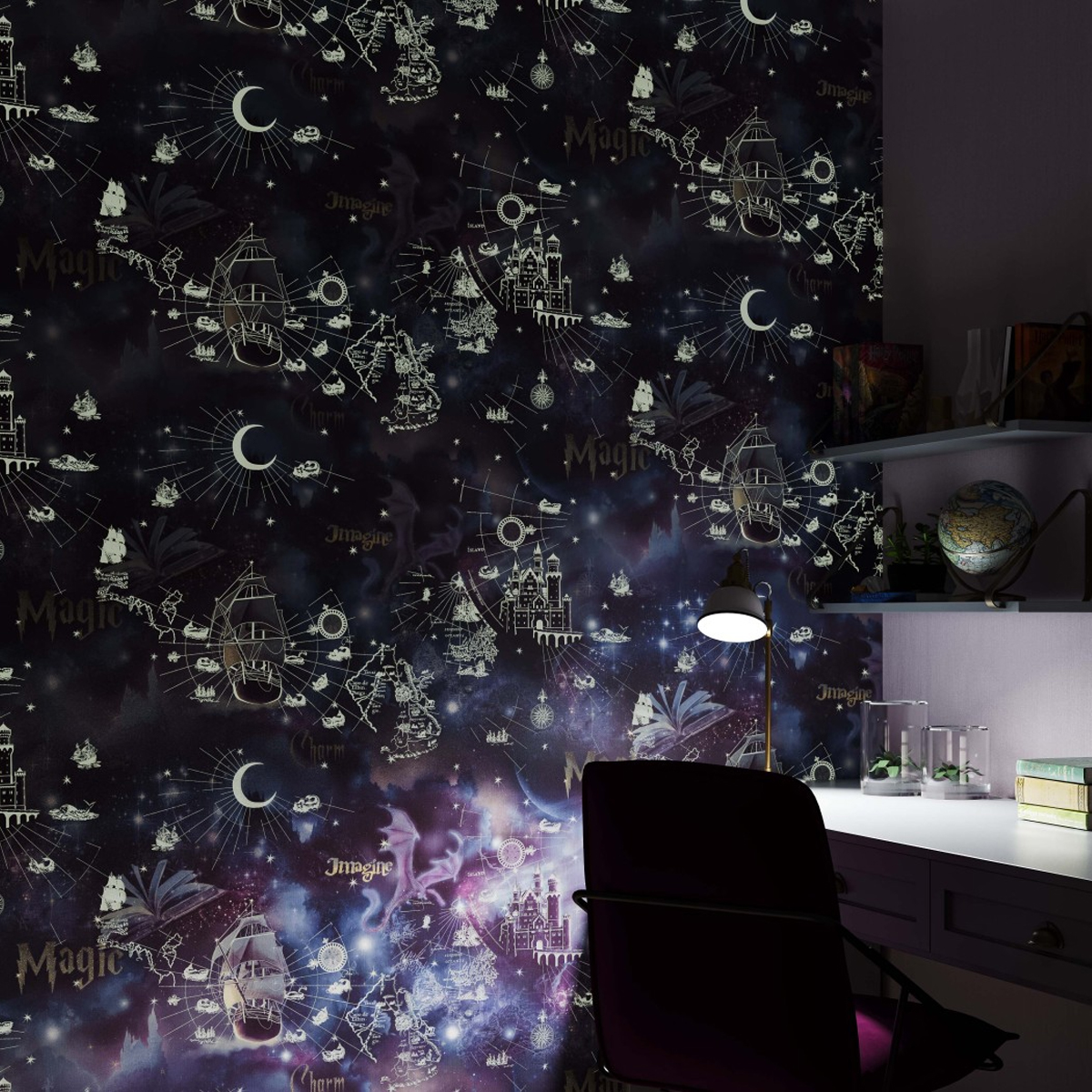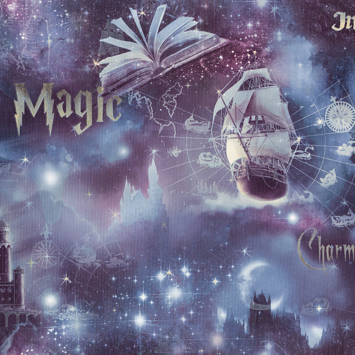 Ах, этот дивный и загадочный мир Сказки! Как здорово прикоснуться к настоящему Волшебству, которого часто не хватает в жизни! Фантастическая коллекция Magic открывает двери всем, кто хочет поверить в Чудо. Насыщенная палитра синего цвета растекается по картине – от загадочного индиго и кобальтового до лазурно-серого и василькового оттенков, охватывая все краски ночи на небосводе. На бескрайние просторы ночной синевы выплывают быстроходный парусник на Млечном пути, рыцарские замки, зодиакальные созвездия, распахнутые страницы старинной книги... Серебряными искорками на темном фоне вспыхивают магические надписи – это придает таинственную нотку. Здесь использован модный эффект свечения – небесные созвездия, паруса на мачтах, контуры географических карт, луна покрыты специальной люминесцентной пастой и в темноте ярко светятся.Характеристики:Тип рисунка: Сюжетный рисунокРаппорт (см): 64Размеры рулона (м): 1.06 х 10.05Способ производства: Горячее тиснениеОснова: Флизелиновая