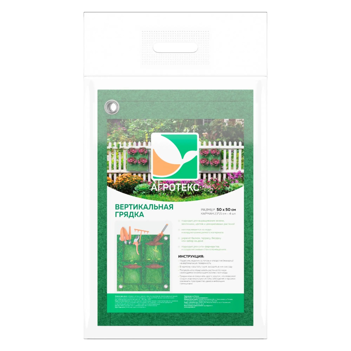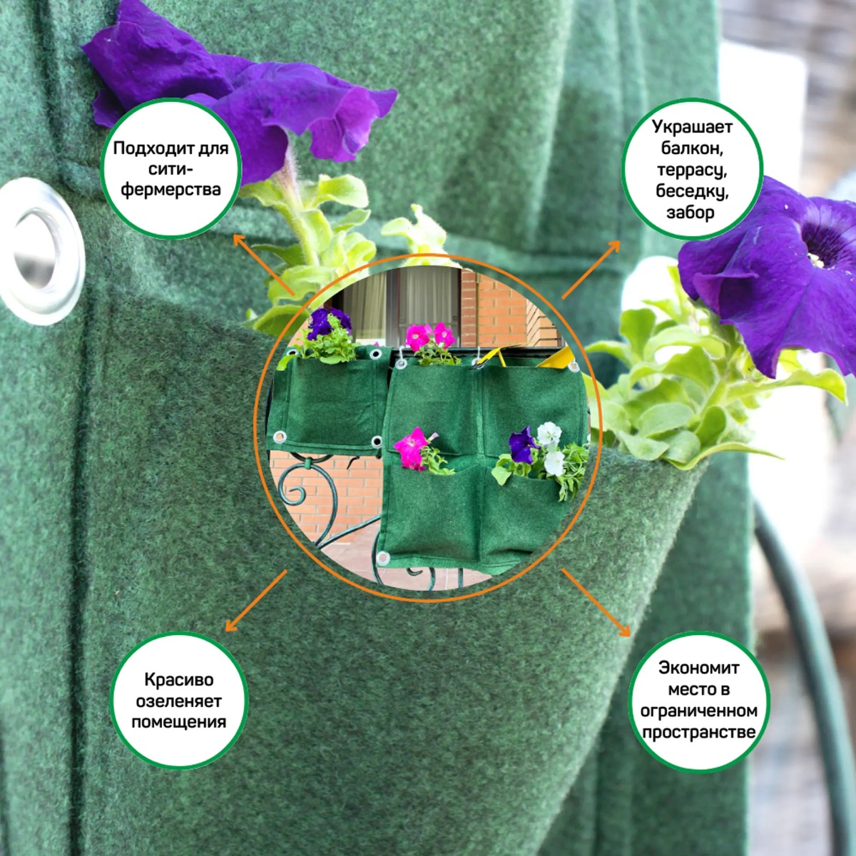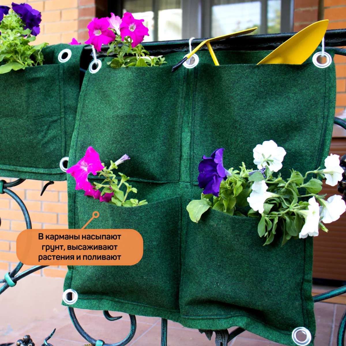 Это универсальное решение для растениеводства, позволяющее вырастить свежую зелень, цветы и ягоды в домашних условиях. Вертикальная грядка украсит балкон, террасу, беседку или забор на даче. Подходит для сити-фермерства и создания живых стен в помещениях.Изделие изготовлено из водо- и воздухопроницаемого материала, имеет карманы и отверстия (люверсы) для подвешивания на вертикальную поверхность. В карманы насыпают грунт, высаживают растения и опрыскивают (поливают) по мере необходимости небольшим количеством воды.Соединение нескольких вертикальных грядок сформирует систему вертикального земледелия или живую стену из декоративных растений. Это помогает сэкономить место в условиях ограниченного пространства и красиво озеленить даже небольшие помещения.Культуры: зелень, салаты. цветы, земляника (клубника), микрозеленьОбщий размер грядки: 50х50 смРазмер одного карамана: 21х23 смОбъем: 1,5 л