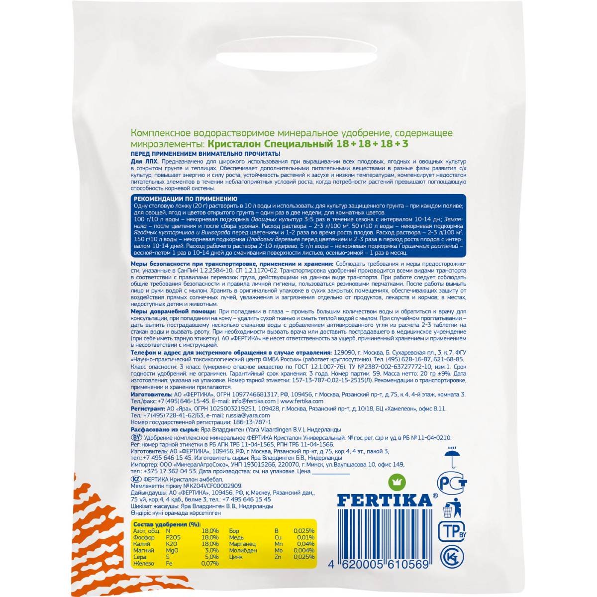 Полностью водорастворимое комплексное азотно-фосфорнокалийное удобрение, содержащее микроэлементы. Предназначено для широкого использования при выращивании всех овощных и цветочных культур в открытом грунте и теплицах. Обеспечивает дополнительными питательными веществами в разные фазы развития с/х культур, повышает энергию и силу роста, устойчивость растений к засухе и низким температурам, компенсирует недостаток питательных элементов в течение неблагоприятных условий роста, когда потребности растений превышают поглощающую способность корневой системы. Применяется в период вегетации растений.