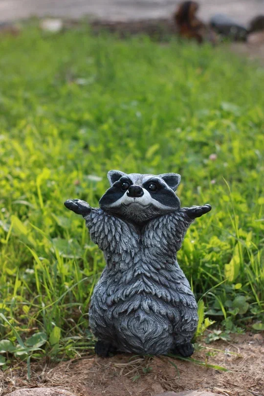 Забавный дизайн: Уникальная поза и жизнерадостный образ енота привносят в ландшафт нотки юмора и сказочности, вызывая улыбку у гостей и домочадцев.
