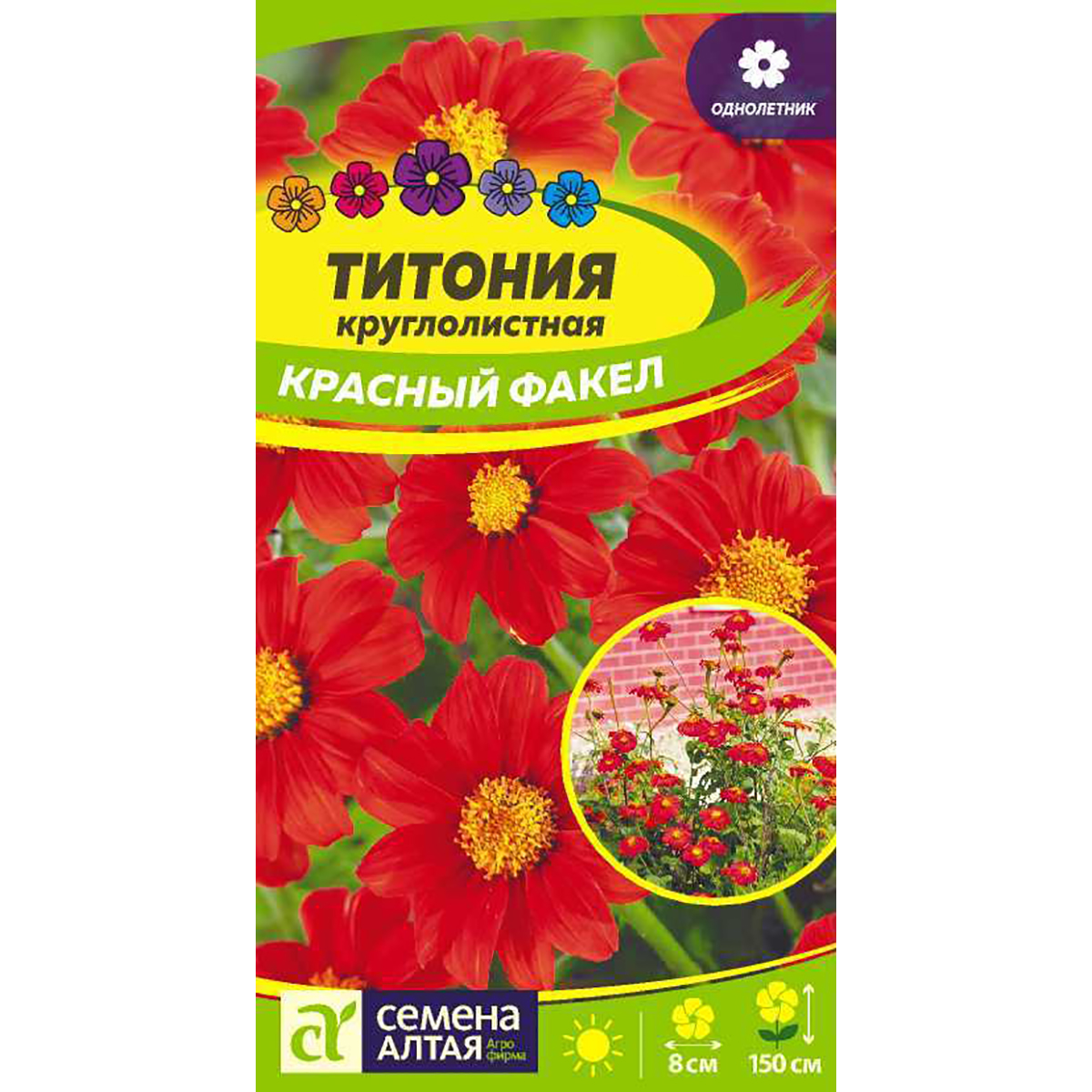 Яркий травянистый однолетник высотой 100-150 см. Разрастаясь, формирует куст до 50 см в диаметре и более, очень мощный, требующий опоры. Слабо опушенные побеги, имеющие красноватый оттенок, увенчаны восхитительными оранжево-красными соцветиями-корзинками с желтым центром. Диаметр соцветий до 8 см. Великолепно выглядит в групповых посадках в миксбордерах, высоких клумбах среди летников, прекрасно подходит для создания цветущих изгородей, используется для срезки.Светолюбивое и теплолюбивое растение, предпочитает рыхлые плодородные почвы. Посев на рассаду проводят в марте-апреле, предварительно замочив семена на сутки. Проращивание следует проводить в плодородном и рыхлом субстрате, не заглубляя семена, а всего лишь вдавливая их в грунт и слегка прикрывая просеянным тонким слоем субстрата.После посева титонии нужно провести обильный полив, выставить контейнеры на свет и в тепло. До выпускания 3-4 листа поливы должны быть регулярными, частыми, их обязательно проводят теплой водой. Высадка рассады в открытый грунт – в конце мая - начале июня, когда минует угроза весенних заморозков. Посадочный интервал – 30-40 см. Возможно выращивание прямым посевом семян в открытый грунт в мае (под пленку), глубина заделки семян – 0,5 см. На тяжёлых почвах растёт плохо. Требуется вносить комплексные минеральные удобрения примерно 1 раз в 3 недели. Цветение продолжается с конца июля до заморозков.