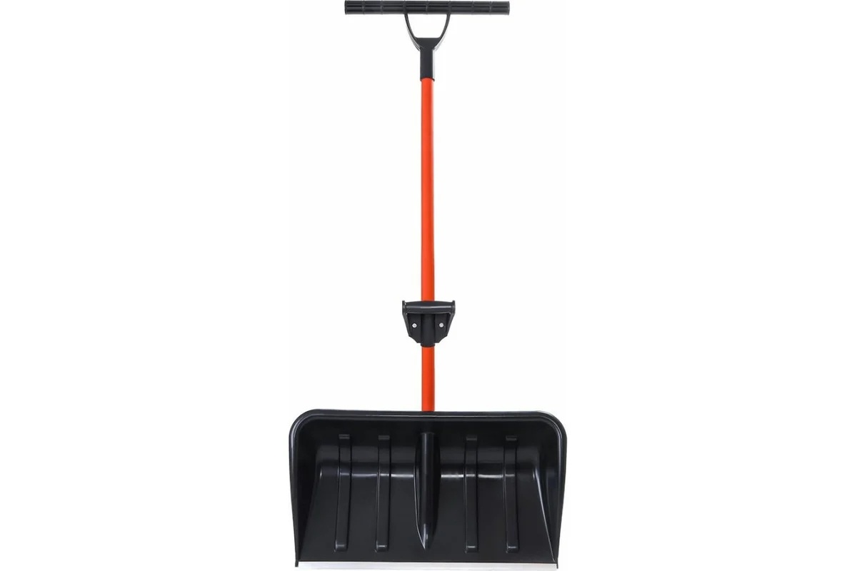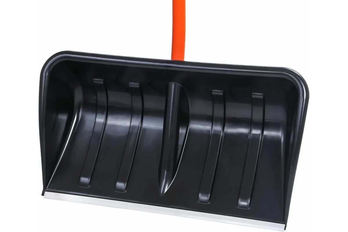 Универсальная конструкция сочетает функции лопаты и скрепера: инструмент удобно толкать двумя руками, а при необходимости — легко перехватить за центр черенка для отбрасывания снега. Ковш выполнен из морозостойкого композиционного пластика и усилен ребрами жесткости, что обеспечивает высокую прочность и устойчивость к нагрузкам. Рабочая кромка защищена алюминиевой планкой по всей ширине ковша, предотвращающей износ и повреждения. Дополнительная ручка в средней части черенка снижает нагрузку на спину и повышает комфорт при работе.