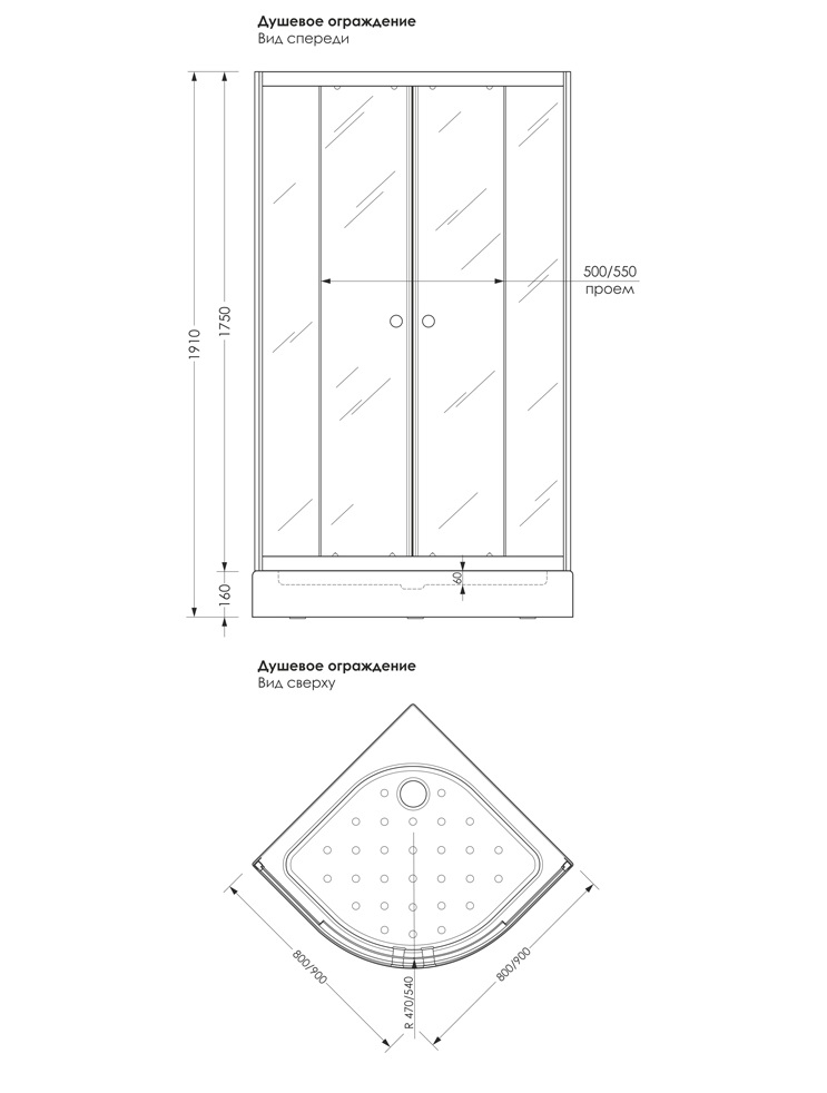 Длина, мм: 800Ширина, мм: 800Высота, мм: 1910Характеристики ширмыФорма: 1/4 кругаДлина, мм: 790Ширина, мм: 790Высота, мм: 1750Тип открывания: Раздвижная система на роликахМатериал заполнения: Закаленное стекло 4 ммСтекло: Прозрачное, матовое, тонированноеРама: Алюминиевый профильТип покрытия рамы: Полимерное окрашиваниеЦвет рамы: БелыйФиксация дверей: Магнитное смыканиеРучки: УниверсальныеШирина открытия проёма, мм: 500Защита от воды: Водонепроницаемые уплотнителиХарактеристики поддонаФорма: 1/4 кругаТип: НизкийДлина, мм: 800Ширина, мм: 800Высота, мм: 160Глубина, мм: 60Материал изготовления: Сантехнический акрил АБС+ПММААрмирование: Жесткий полиуретанДно поддона: Закладной элемент ДСПОпорная конструкция: Сборно-сварной металлический каркасЭкран: Литой с поддономЦвет поддона: БелоснежныйПокрытие дна поддона: АнтискользящееДиаметр сливного отверстия, мм: 90Максимальная нагрузка, кг: 300