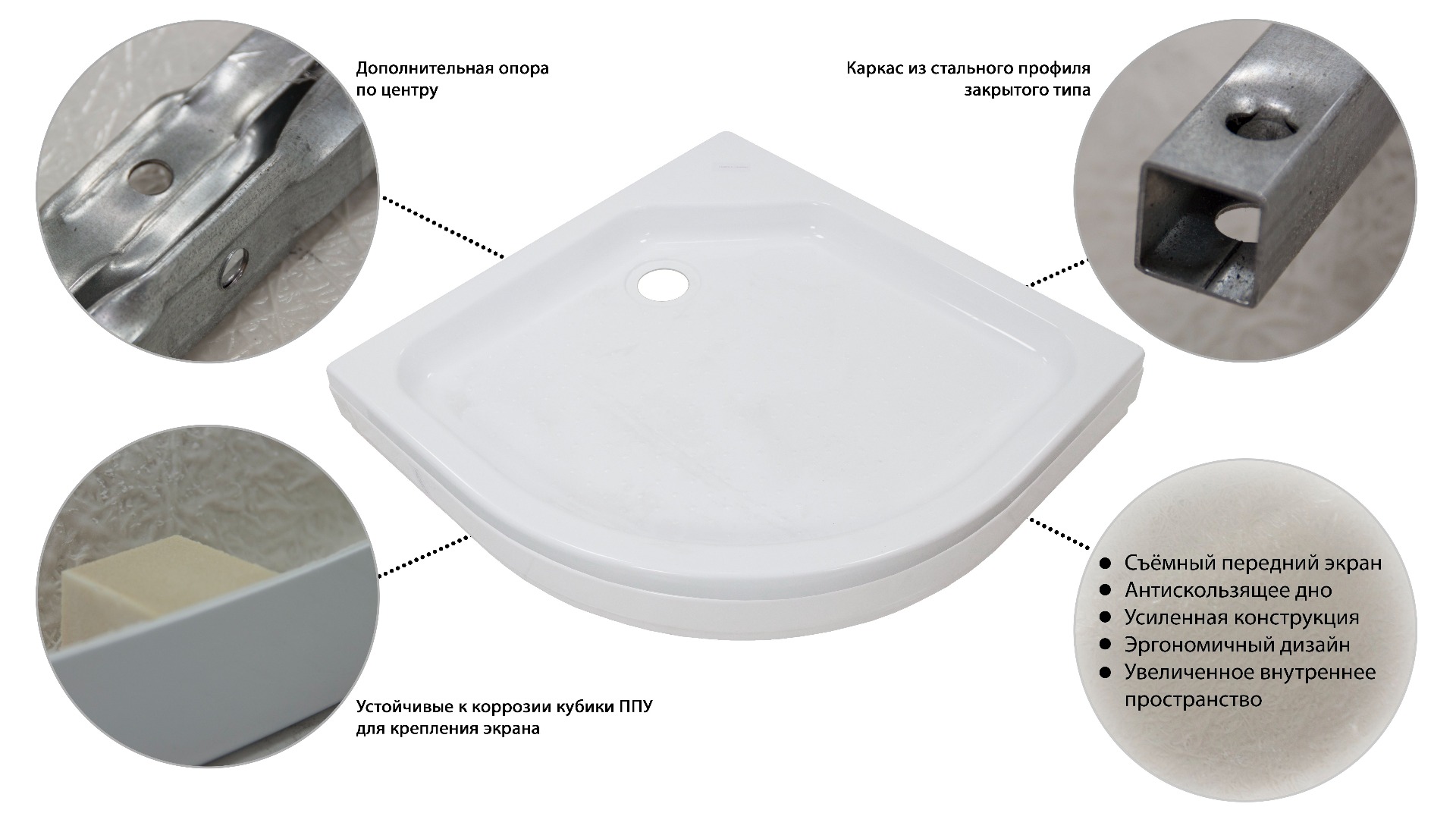 Поддоны изготовлены из Австрийского листа Senosan c антибактериальным покрытием. Бортик по краям поддона предотвращающий попадание воды из вне. ОСНОВНЫЕ ПРЕИМУЩЕСТВА: Выдерживает нагрузку до 300 кг. Возможность комплектовать душевым углом. Ширина: 90 см Длина: 90 см Материал: акрил Форма: полукруглая Ножки: Есть Цвет: белыйГлубина поддона: 6,5см.