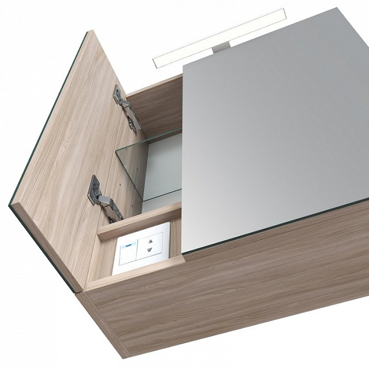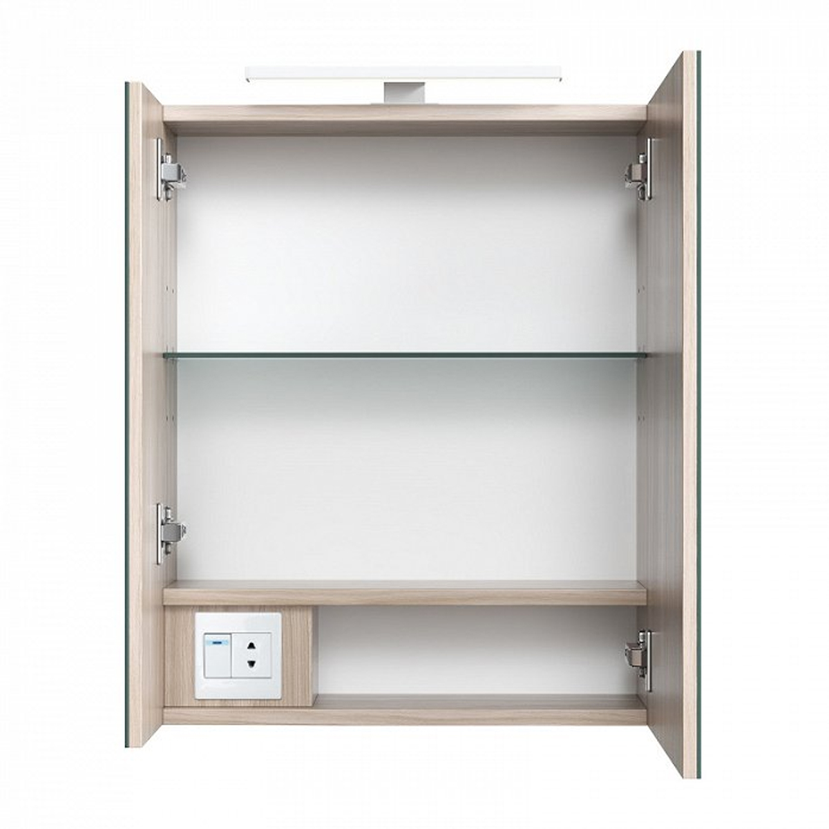Стильный, современный шкаф-зеркало для ванной комнаты. Две распашные зеркальные дверцы. Стеклянная полка крепится на фиксаторы. Выносной LED-светильник, кнопка включения расположена на фронтальной части, рядом со встроенной розеткой. Петли с доводчиками.Характеристики:Коллекция: MirroВысота изделия, мм: 600Длина изделия, мм: 166Дополнительный материал: СтеклоМатериал корпуса: ВЛДСПОрг. внутр. пространства: Вкладная полка (стекло) с фиксаторамиОриентация: ПраваяОсновной материал: Зеркальное полотно/ВЛДСППодсветка в комплекте: ДаПокрытие корпуса: ВодозащитноеСистема хранения: ДверкиТип выключателя: МеханическийТип лампы: LED-лампаТип монтажа: ПодвеснойТип светильника: ВыноснойТип установки: К стенеТолщина фасада: 16 ммХарактеристики фурнитуры: ДоводчикЦвет изделия: ДеревоЦвет фурнитуры: ХромШирина изделия, мм: 500Электроподготовка: Выключатель ; розеткаТип упаковки: картонная коробка