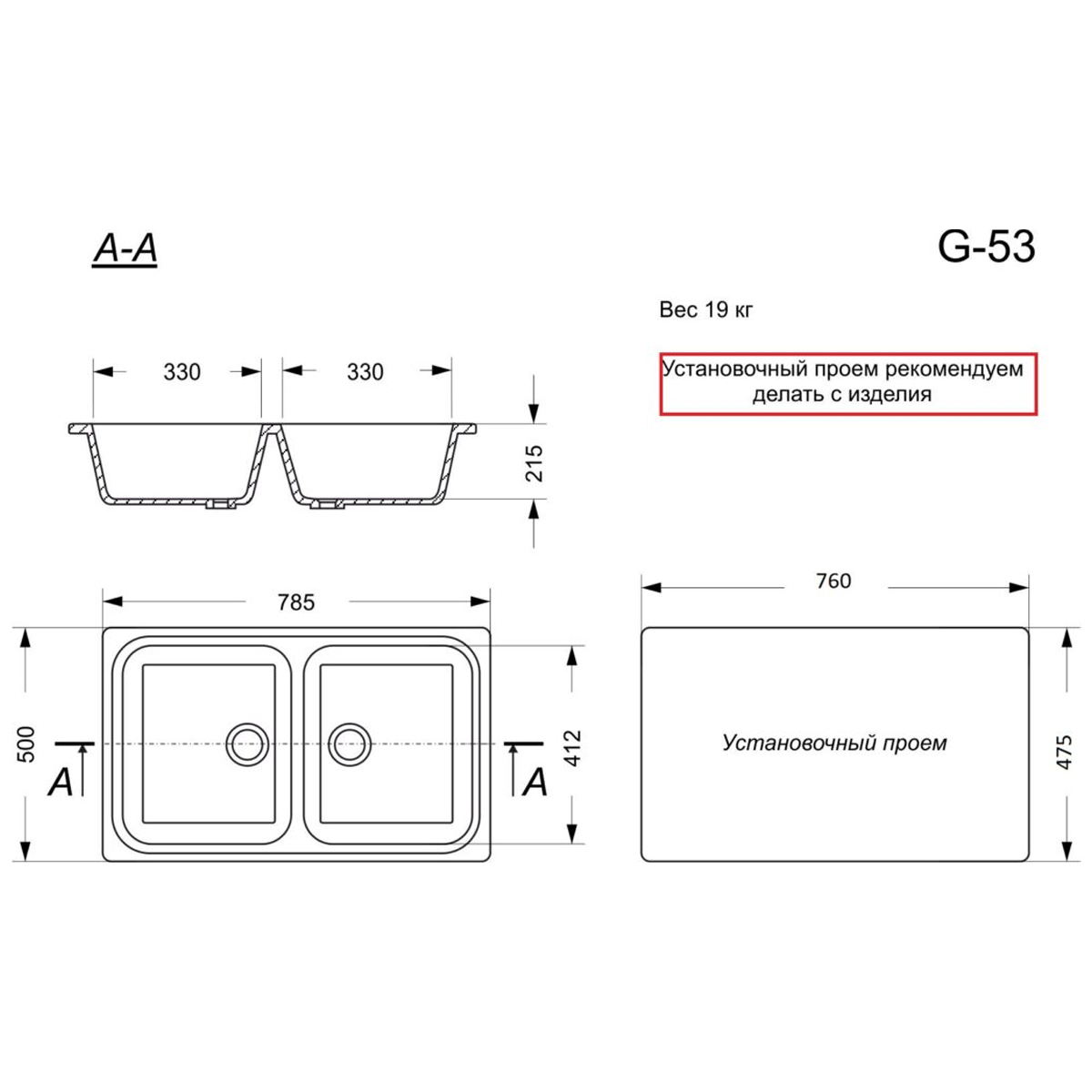 Продукция из литьевого камня соответствует ГОСТ 15167-93 и изготовлена из современных экологически чистых материалов, состоящих из природного молотого мрамора (80%) и полимерных связующих (20%), с добавлением специальных пигментов. Рабочая поверхность изделия покрыта декоративно-защитным слоем (гелькоут). Данное покрытие придает кухонной мойки красивый вид и надежно защищает от различных воздействий. Мойка с таким покрытием не впитывает грязь, жир и различные красители.Характеристики:Способ установки: Классический врезнойФорма: ПрямоугольнаяКоличество чаш: ДвеОбщий размер: 780х500 ммРазмер чаши: 412х330х215 ммУстановочный проём: 760х475 мм