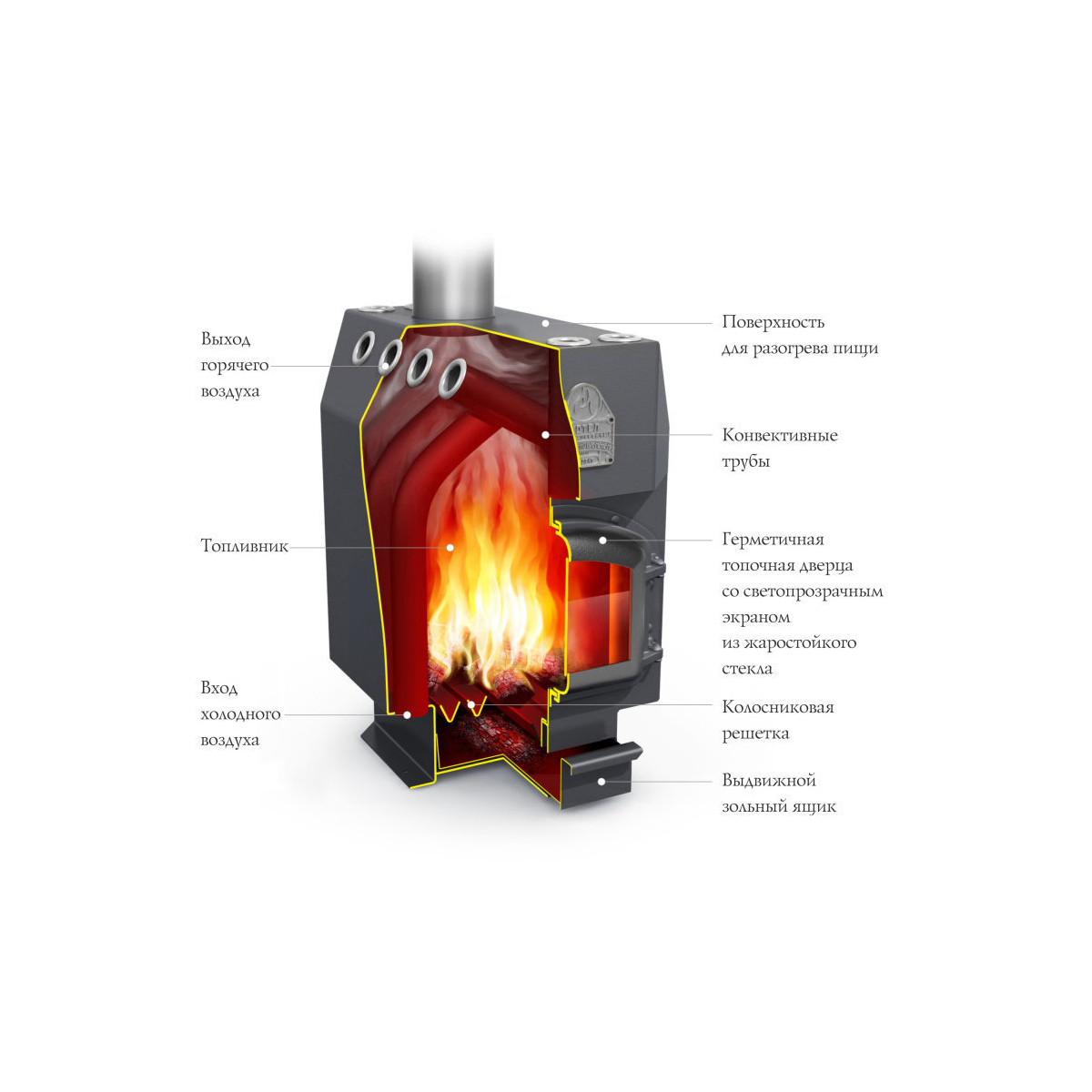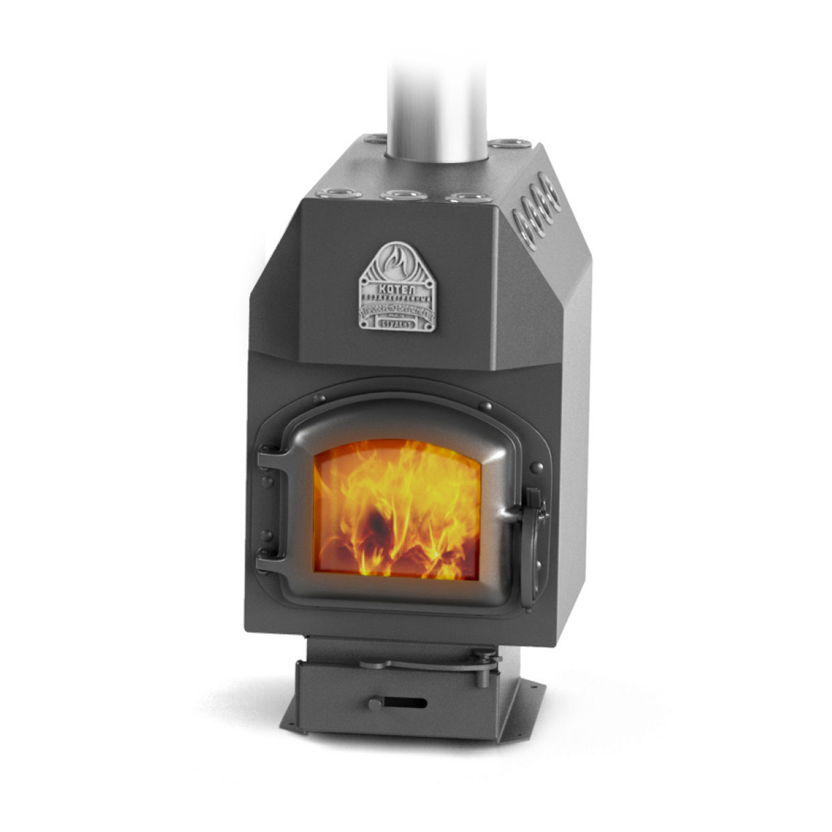 Базовая модификация печи "Студент Уголь", отличающаяся наличием чугунной дверцы с жаростойким стеклом, чугунного колосника, экрана для защиты конвективных труб от прогорания. Модификация имеет выход дымовой трубы вверх.Линейка твердотопливных воздухогрейных котлов длительного горения "Профессор" номинальной мощностью от 6 до 40 кВт предназначена для экономичного воздушного отопления жилых и нежилых помещений максимальным объемом от 100 до 1000 м3 соответственно. В линейку входят модели "Гимназист", "Студент", "Инженер", "Доцент" и "Профессор", объединенные общим принципом действия, компоновкой и применяемым топливом. Отличаются они габаритными размерами, массой, объемом камеры сгорания, диаметром и количеством конвективных труб, площадью поверхностей нагрева, а также диаметром выхода дымохода.За счет дополнительно установленных съемников тепла, обеспечивается возможность направить горячий воздух с боковых конвективных труб через воздуховоды в смежные помещения.