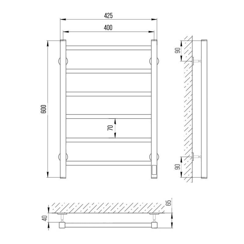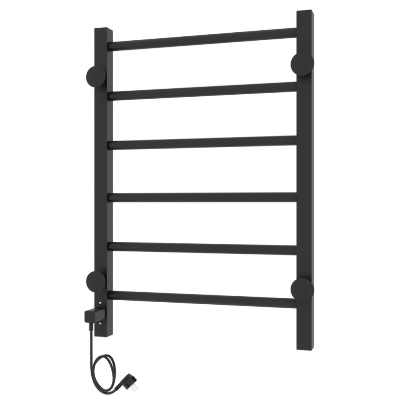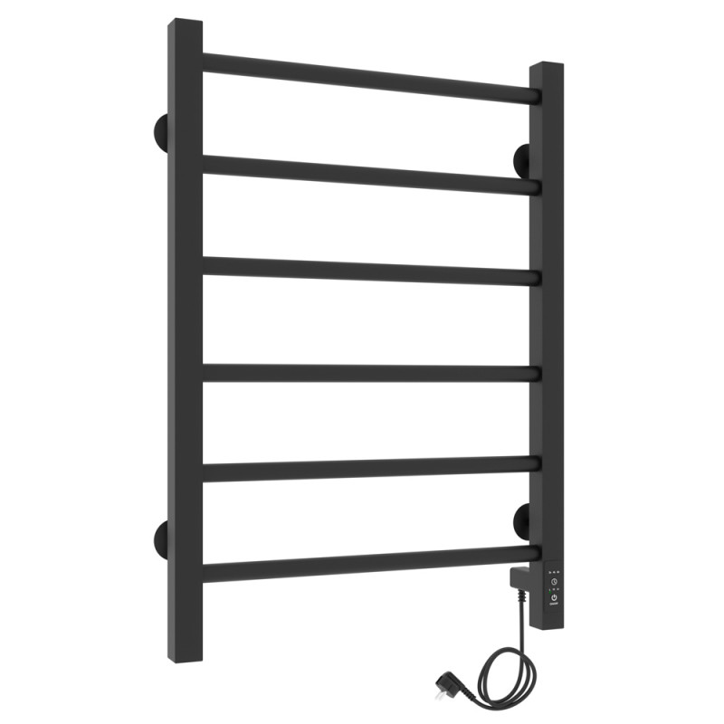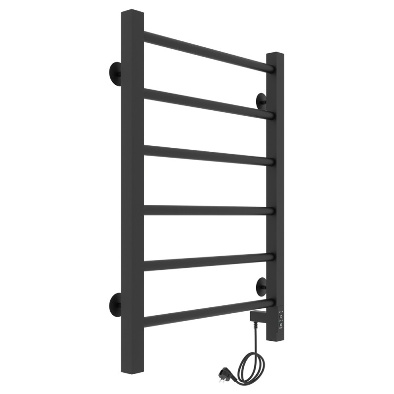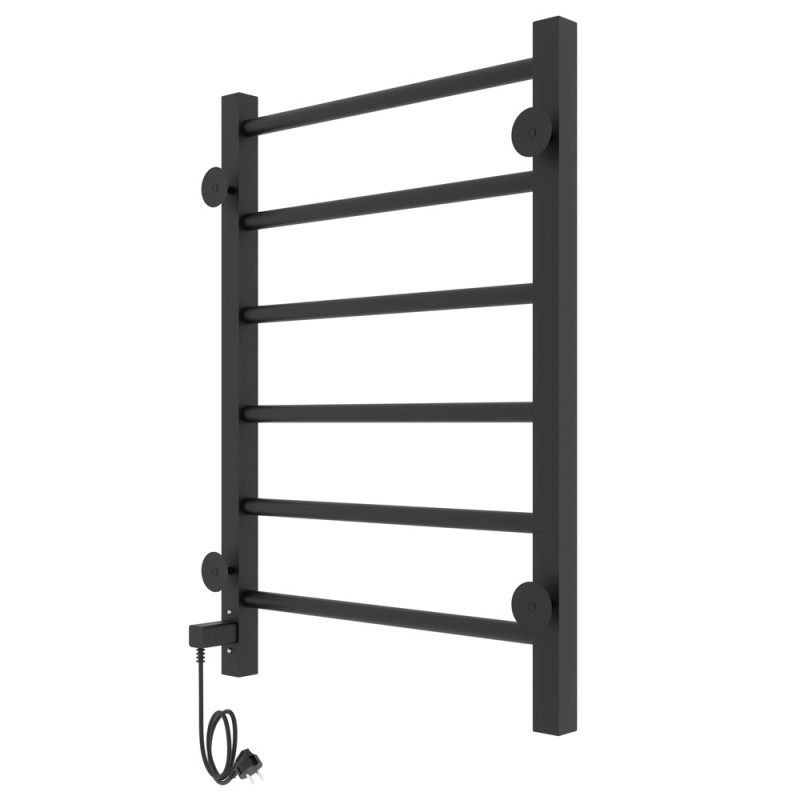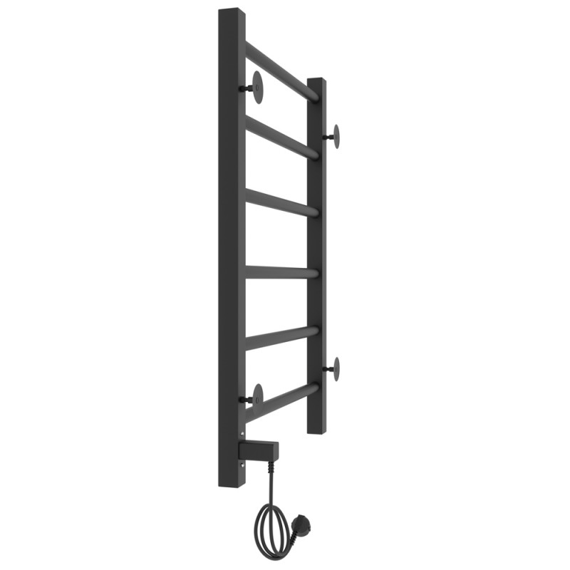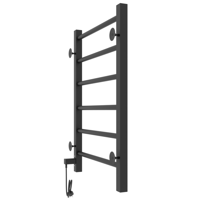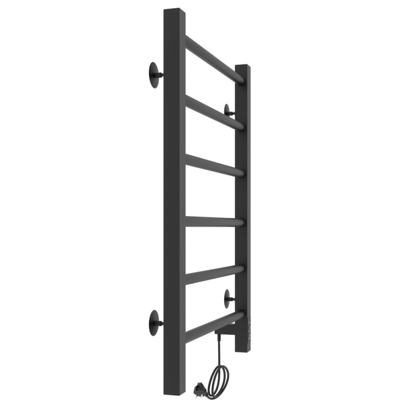 Корпус состоит из двух вертикальных коллекторов и ряда горизонтальных поперечин. Перекладины можно использовать для навешивания и просушки влажных полотенец. В одном из коллекторов прибора размещается нагревательный элемент. Внутри полотенцесушитель может быть заполнен подготовленной водой, антифризом или воздухом.Материал: сталь чернаяПокрытие: краска порошковая черная RAL 9005 (черный матовый муар)Диаметры и толщина: стойка 30х30, толщина 1,5 мм; перемычка Ø20, толщина 1,5 ммРегулятор: на стойке (программируемый регулятор)Терморегулятор: даТаймер: даВозможность скрытого монтажа: да (в комплекте)Размещение шнура: справаТемпература поверхности изделия*: 50±5°CНапряжение питания: 220 ВВес: 3,7 кг
