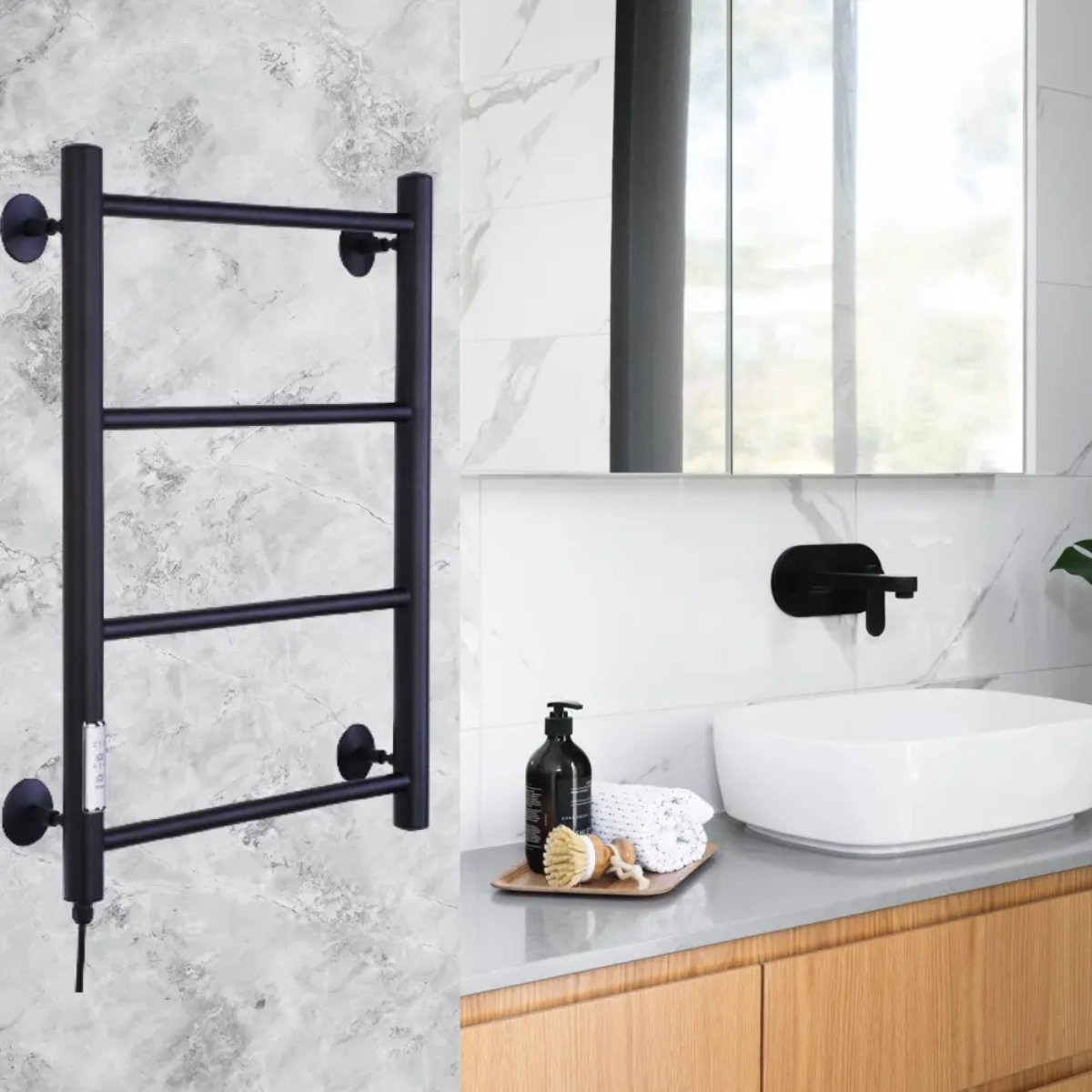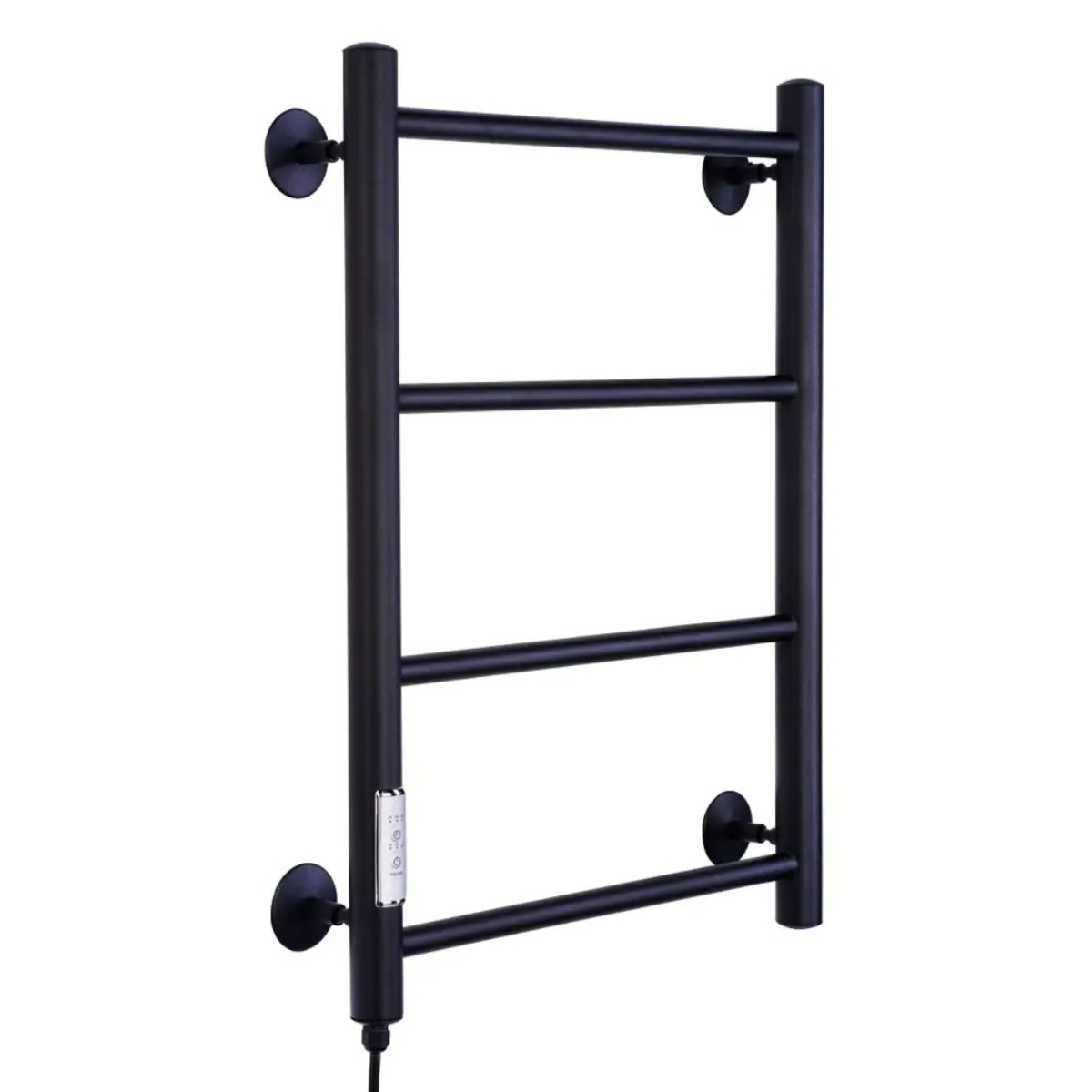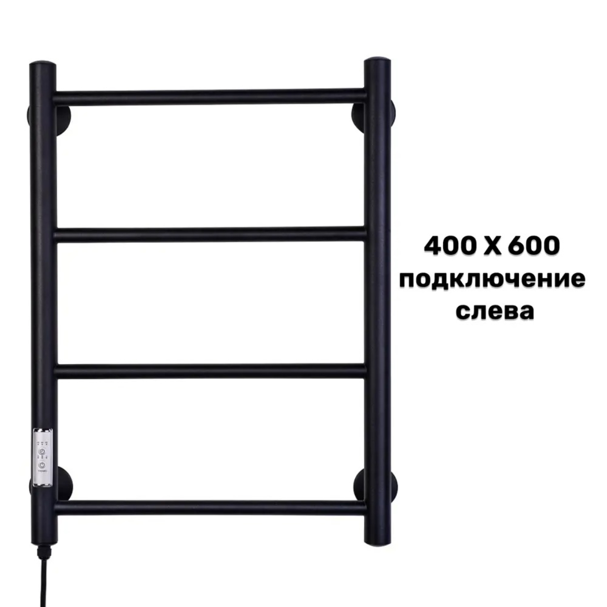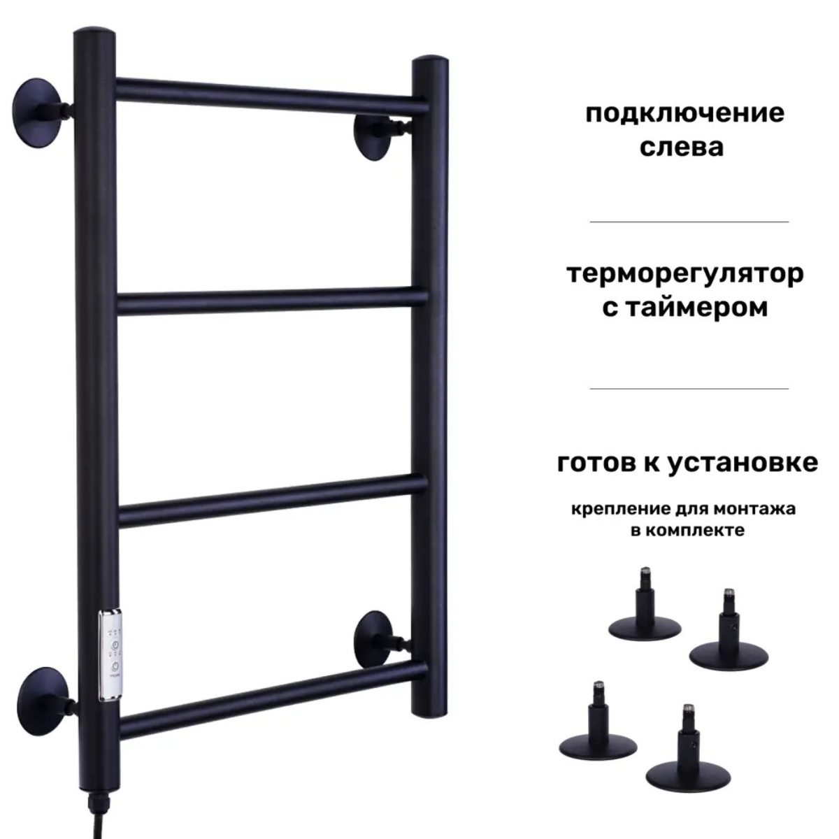 Полотенцесушитель электрический с терморегулятором лесенка Прямая** изготовлен из нержавеющей стали в классическом стиле и окрашен в модный чёрный матовый цвет. Лаконичный дизайн органично впишется в любой интерьер, а благодаря компактным размерам такой электрический полотенцесушитель можно разместить даже в небольшой ванной комнате. Простота установки и подключение к розетке (сети) позволит быстро задействовать электроприбор. Особенности:Электропровод с вилкой расположен в левой стойке полотенцесушителя;Шнур электрический с вилкой 1,10 м, вилка с заземлением;Диаметр вертикальных стоек 32 мм;Диаметр горизонтальных перекладин 18 мм;Количество перекладин 4;греющий элемент нагревательный кабель (технология сухой тэн);Теплоотдача 110 Вт;Температура нагрева 50-55 °С;Три режима нагрева, таймер на 2/4/6 часов;Модель без возможности скрытого подключения.Преимущества:изготовлен из нержавеющей стали, отличающейся высокой теплоотдачей и прочностью;устойчив к воздействию коррозии;легкий монтаж;Тип продукта: Электрический полотенцесушительТЭН: СухойМощность (Вт): 110Количество рядов: 4Подключение полотенцесушителя: ЛевыйВозможность скрытого подключения: НетФорма полотенцесушителя: ЛесенкаТип шва: Контактная сваркаС полкой: НетТерморегулятор: ДаТип терморегулятора: ЭлектронныйТаймер: ДаЦифровой дисплей: НетТеплоотдача (Вт): 110Площадь нагрева (в м²): 1.1Напряжение (В): 220Диаметр трубы (мм): 32Защита от перегрева: ДаПоворотный: НетДлина кабеля (м): 1.1Степень защиты (IP): IP54Основной материал: Нержавеющая стальПокрытие: Порошковая краскаЦвет: Черный матовыйСостав комплекта: крепление телескопическое 4шт, паспорт изделияВес, кг: 2.5Выключатель: Да