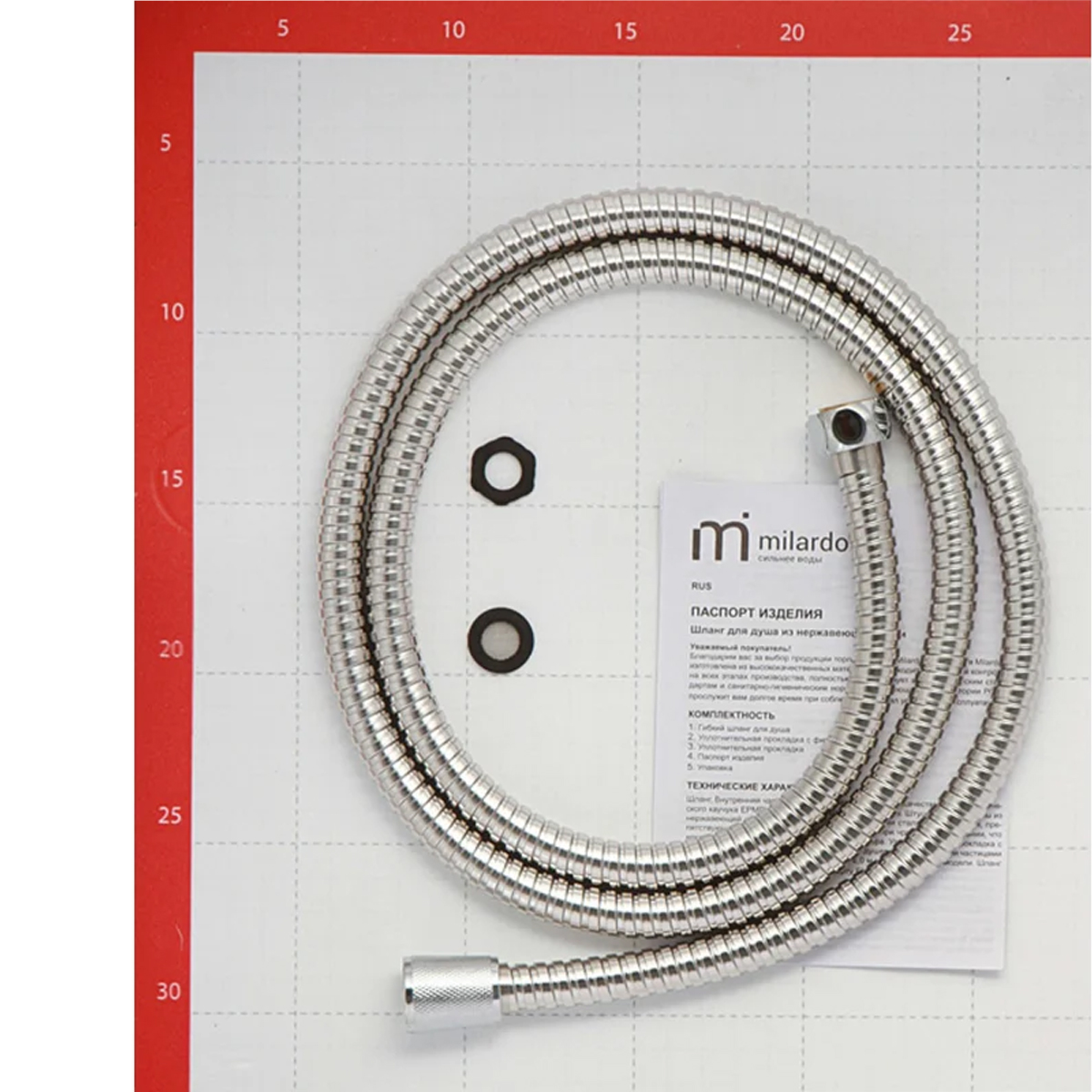 Шланг для душа Milardo 1,5м, 130 130S150M19 используется совместно со смесителем и лейкой. Изделие изготовлено из нержавеющей стали. Длина - 1,5 метра. Шланг обладает защитным фильтром, который не пропускает мелкие песчинки в лейку и исключает ее засорение.Особенности Milardo 130 1,5 мУниверсальностьДанный шланг подойдет для присоединения к большинству леек.Защита от засоренияСпециальный фильтр на выходе из шланга позволяет защитить лейку от засорения мелкими песчинками из водопроводной воды.Технические характеристики Milardo 130 1,5 мМатериал: нержавеющая стальДлина: 1.5 мДиаметр: 14 ммДиаметр соединения: 1/2Подключение к смесителю: 1/2FПодключение к лейке: 1/2 (конус)Класс товара: БытовойАрмированный: естьРастягивающийся: нетГофрированный: естьГладкий: нетЦвет: хромПреимущества Milardo 130 1,5 мКорпус Milardo 130 130S150M19 изготовлен из нержавеющей стали марки 304;Длина - 1,5 метра;Долговечность;Эластичность.