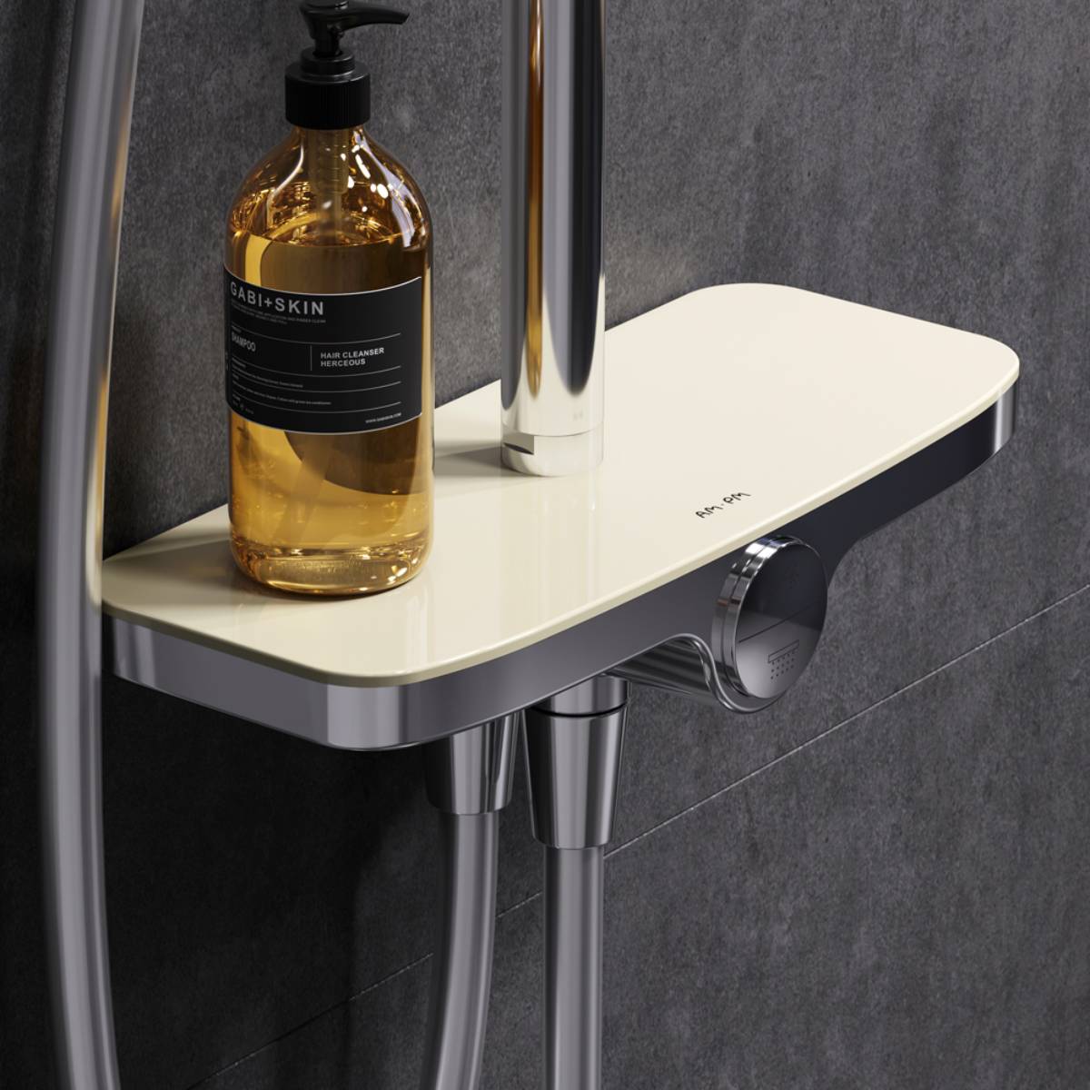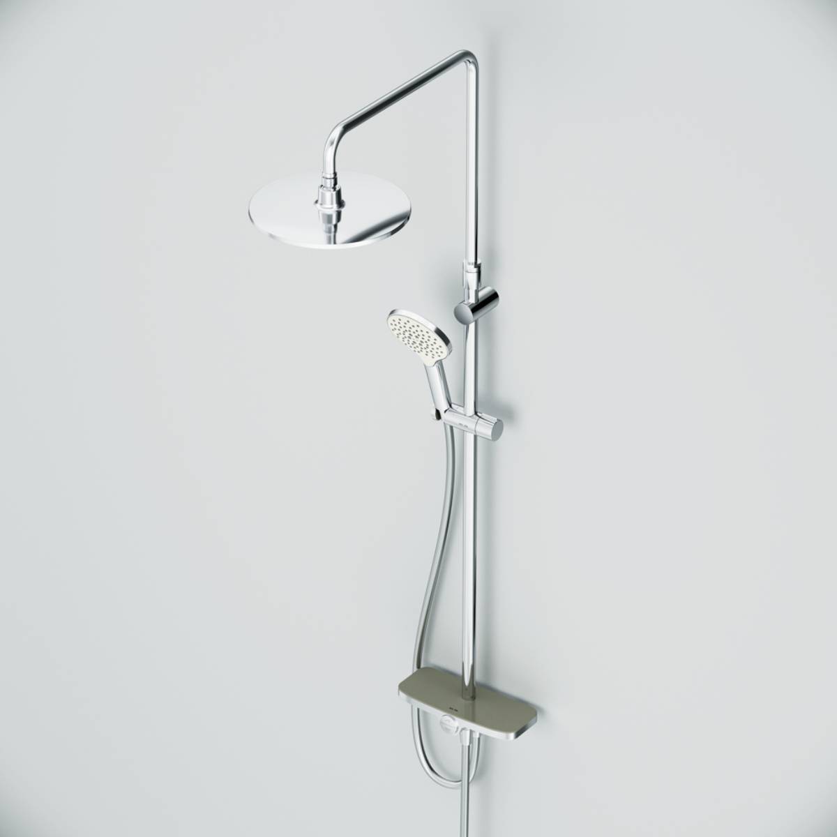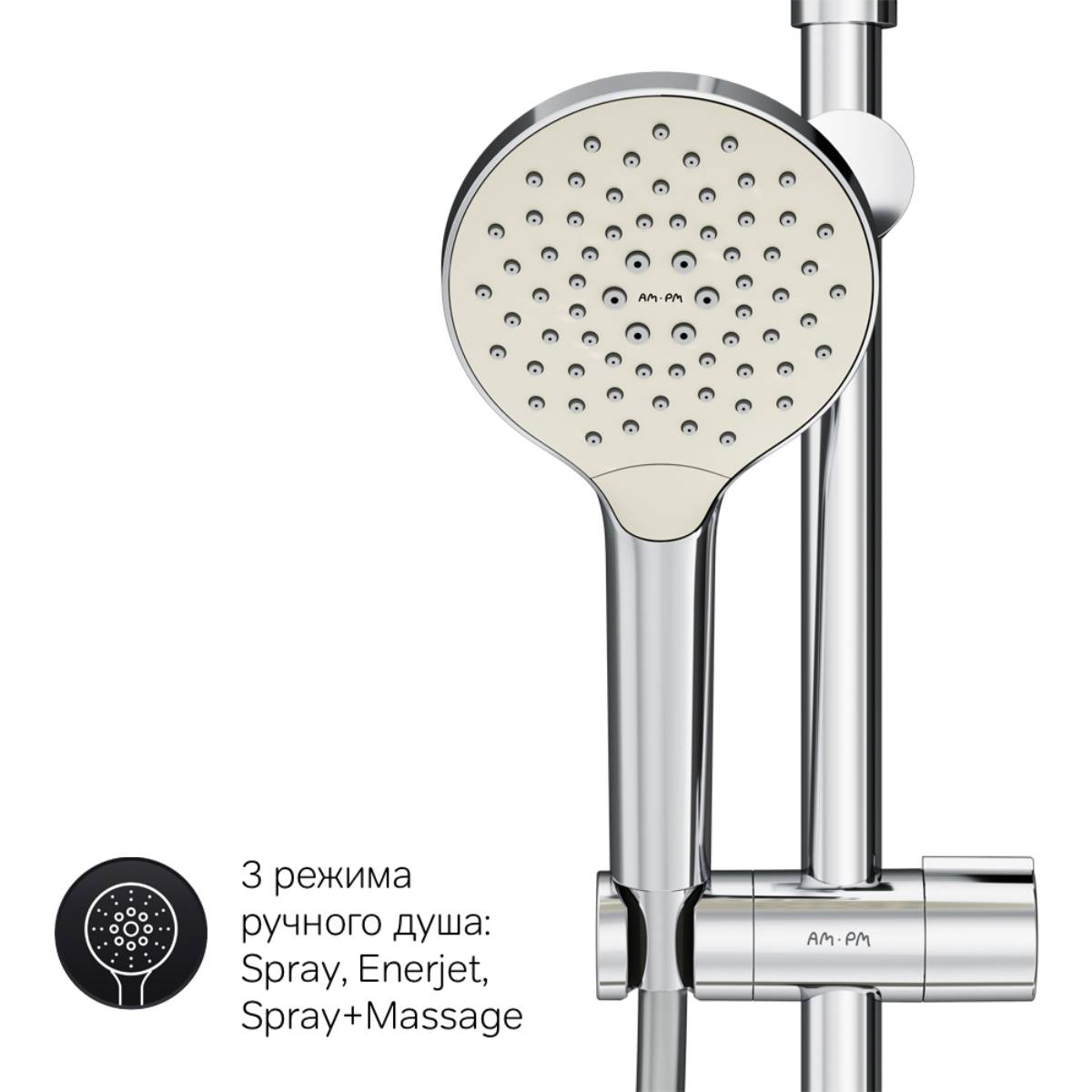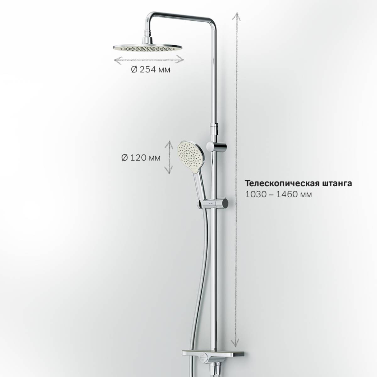 Тотальный дизайн в действии: все детали душевой системы – от пропорций ручного и верхнего душей до рисунка расположения форсунок на лейках.Премиальные размеры и продуманные детали: увеличенный диаметр душевых леек (верхний душ 254 мм и ручной душ 120 мм) позволит ощутить преимущества тропического душа, тогда как увеличенная длина шланга 1750 мм обеспечит свободу движений во время принятия душа. Телескопическая поворотная штанга регулируется по высоте в диапазоне от 1030 до 1460 мм, обеспечивая комфорт для людей любого роста, а шаровой шарнир в держателе верхнего душа позволяет регулировать угол его наклона.Нижнее крепление штанги выполнено в виде полочки, а переключатель верхний-ручной душ является ее продолжением. Нажав на него, вы можете менять источник потока воды от ручной лейки к верхнему душу.Характеристики:Покрытие: глянцевое.Материал: латунь, ABS-пластик, нержавеющая сталь.Количество режимов: 3 режима ручного душа: Spray, EnerJet, Spray + Massage.Размер ручного душа: 120 мм.Размер верхнего душа: 254 мм.Высота изделия: 1030-1460 мм.Глубина изделия: 569 мм.Ширина изделия: 254 мм.