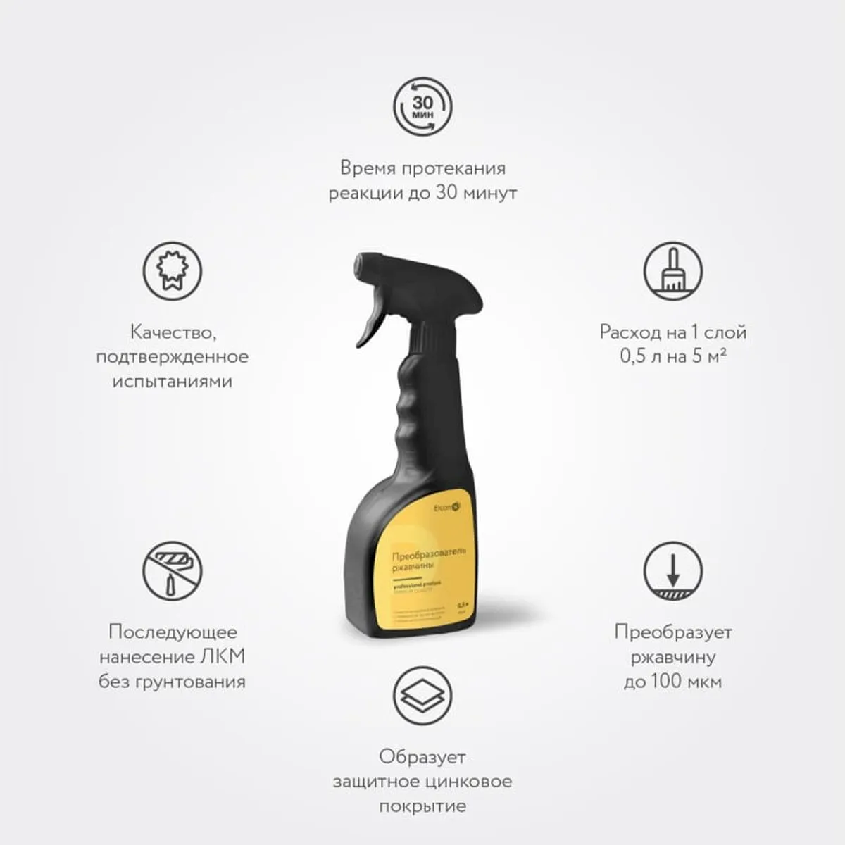 Elcon Преобразователь ржавчины P с цинком, удалитель ржавчины, 0,5 л триггер 00-00004030 предназначен для удаления ржавчины с поверхностей черных металлов, арматурных сталей, труб, паропроводов, водопроводов, различных металлоконструкций перед нанесением лакокрасочных покрытий.После применения средства на поверхности ржавого металла происходит химическая реакция, в результате которой образуется цинко-фосфатное покрытие. Средство может быть использовано для преобразования ржавчины толщиной до 100 мкм.Преобразователь ржавчины используется как при первичной окраске (для обработки окалины и сварных швов), так и по остаткам прочно держащейся ржавчины.Указания к применению :Обработку металлических конструкций преобразователем ржавчины Elcon P следует проводить при температуре окружающей среды от +5 °С до +35 °С.Поверхность, подлежащую обработке, необходимо очистить от загрязнений, лакокрасочных и иных покрытий.Очистить металлическую поверхность от рыхлой, отслаивающейся ржавчины металлической щеткой.Нанести средство Elcon P кистью, валиком или тампоном два раза с промежуточной сушкой до появления белого налета из преобразованной ржавчины.Время протекания реакции – до 30 минут.Выдержать до полного высыхания, смыть водой.Нанести финишный лакокрасочный материал в соответствии с инструкцией по применению не позднее 2-х суток с момента обработки.Области применения :Ржавые поверхностиТехнические характеристики :Вид: преобразователь ржавчиныОбъем: 0.5 лСостав: ортофосфорная кислота, функциональные добавкиРасход: 130 г/м2Уровень рН: 2.0-3.0Кислотный: естьС цинком: даВид тары: бутыль с распылителемВес нетто: 0.7 кгМарка: нетБез запаха: нетПреимущества :Образует защитное цинковое покрытиеПреобразует слой ржавчины толщиной до 100 микронПреобразует ржавчину до 100 мкмОбразует защитное цинковое покрытиеВремя протекания реакции – до 30 минутПоследующее нанесение ЛКМ без грунтованияНанесение от +5 °С до +35 °СРасход на 1 слой 100-130 г/м2