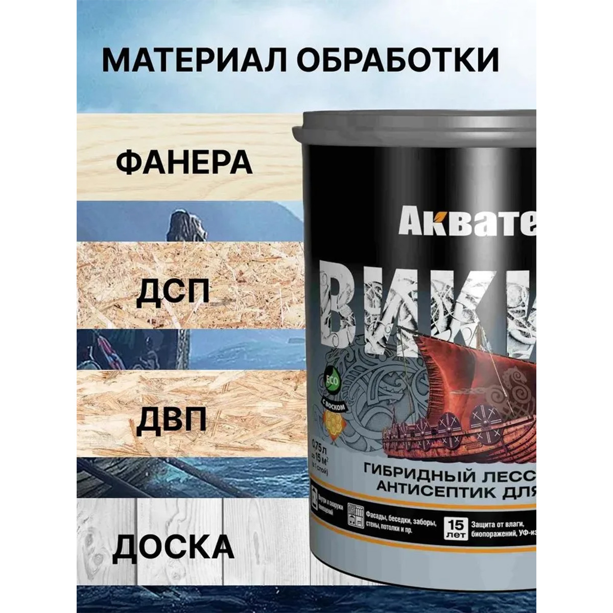 Антисептик для дерева Акватекс Викинг Гибридный лессирующий, тик, 2,5 л – золотистый оттенок с прозрачной лессирующей текстурой, который подчеркивает красоту и естественный рисунок дерева. Эффективно защищает от влаги, плесени, грибка и выцветания. Применяется для наружных и внутренних работ, фасадов, мебели и декоративных элементов. Легкое нанесение и быстрое высыхание обеспечивают долговременную защиту и привлекательный вид древесины.