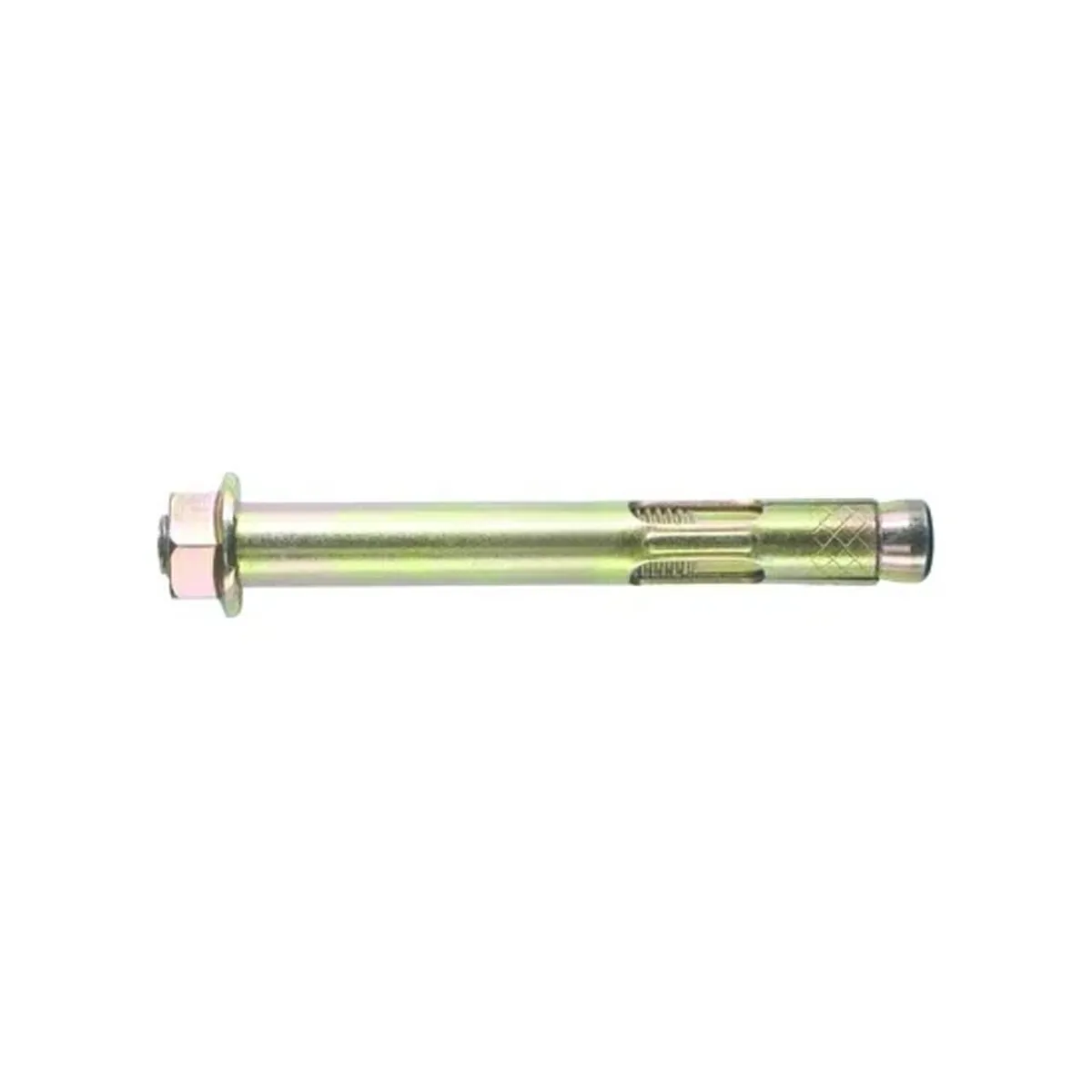 Анкер с гайкой подобного типа является аналогом болта с гайкой, однако здесь вместо стержня (шпильки) и гайки используется стандартный болт. При закручивании болта с помощью гаечного ключа конусообразный конец деформирует гильзу, тем самым заполняя стенки отверстия и закрепляя конструкцию в нем. Также может выпускаться в варианте для закручивания отверткой. Используется для крепления тяжеловесных конструкций, кабельных трасс, несущих консолей, перильных ограждений и т.п. методом сквозного монтажа к полнотелому бетону, природному строительному камню, полнотелому кирпичу. Может применяться для крепления к тонким бетонным перегородкам.Технические характеристики :Диаметр резьбы: М10Диаметр установки: 12 ммДлина анкера: 200 ммМатериал: стальПокрытие: желтопассивированный