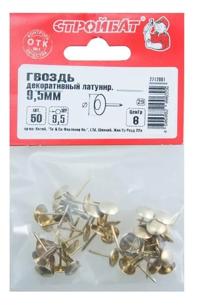 Декоративный гвоздь может быть использован для декорирования различных изделий из дерева, МДФ, фанеры.Гвозди декоративные предназначены для лицевого крепления мягких тканей на различных деревянных основаниях. Широко используется на мебельных фабриках и в быту. Как правило, декоративные гвозди имеют тонкий стержень и широкую шляпку, позволяющую удерживать ткань. Рекомендуется забивать декоративные гвозди деревянным молотком или киянкой, чтобы в случае промаха не повредить обивочный материал.Внимание: цена указана за упаковку.