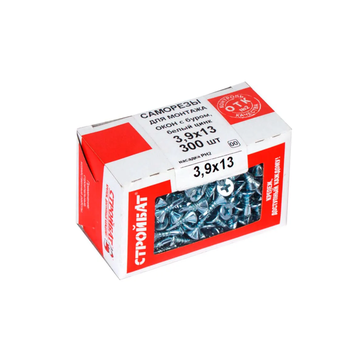 Технические характеристики саморезов Стройбат с буром белый цинкДиаметр: 3.9 ммДлина: 13 ммШлиц: Phillips (PH)Покрытие: оцинкованныйЦвет покрытия: белый цинкТип фасовки: шт.Фасовка: 300 штФасовка: 0.3 кгФорма головки: потайнаяНаличие пресс-шайбы: нетРазмер шлица: PH2Материал: сталь