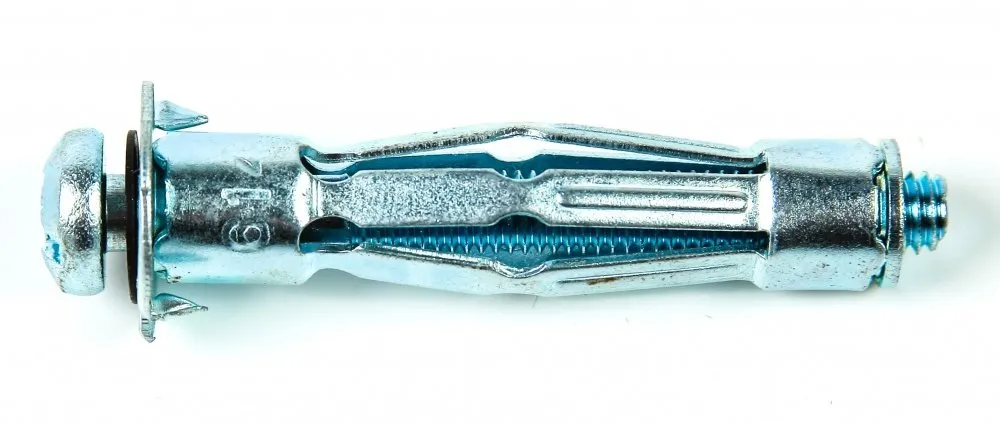 Металлический дюбель для пустотелых конструкций применяется для крепления к основаниям, отличающимся низкой несущей способностью, таким как ГКЛ, ДСП или пустотелые материалы с небольшими размерами пустот.Дюбель состоит из полой цанги и винта. Цанга, в свою очередь, состоит из нераспорной части, длина которой подбирается под толщину несущей основы, и четырех фиксирующих сегментов. Бортик дюбеля защищает его от проваливания в отверствие. Острые зубцы, распололженные на стопорном бортике, предотвращают проворачивание дюбеля.