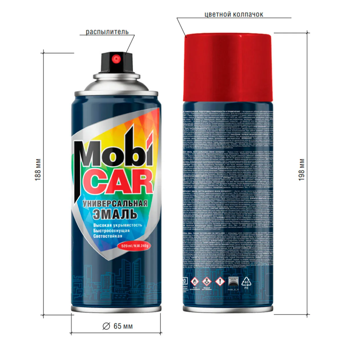 Универсальная эмаль Mobicar используется в декоративно-оформительских работах, строительстве и ремонте. Аэрозольная эмаль удобна для окрашивания небольших поверхностей и труднодоступных мест. Образует гладкое, устойчивое к выцветанию покрытие.Тип: кузовной ремонт автомобиляВид: автоэмальОбъем: 520 мл