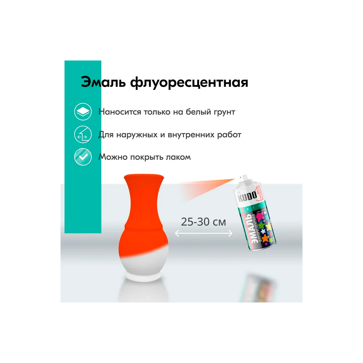 Специальная эмаль со светоотражающей способностью для создания предупредительных и сигнальных эффектов на дорожных знаках и технике, станках, ступенях, элементах ограждений, а также для оформительских работ и декоративного окрашивания.При ультрафиолетовом облучении интенсивность свечения эмали увеличивается.ПрименениеВажно! Эмаль наносится только на белый грунт. В противном случае флуоресцентный эффект не проявится в полной мере.Во избежание попадания следов аэрозоля рекомендуется защищать поверхности, не подлежащие окраске.Для достижения наилучших результатов эмаль наносить при температуре окружающей среды не ниже +10°С.Перед использованием баллон энергично встряхивать в течение 2–3-х минут.Эмаль наносится на предварительно обезжиренную, зачищенную, загрунтованную и зашлифованную поверхность. Для грунтования поверхности рекомендуется использовать "Грунт акриловый универсальный KUDO®".Эмаль наносится с расстояния 25–30 см в 2–3 слоя с промежуточной сушкой 10–15 минут при температуре +20°С. Время высыхания при температуре +20°С не менее 30 минут.Для придания большей устойчивости к воздействию внешних факторов желательно окрашенную поверхность покрыть лаком. Рекомендуется использовать "Лак акриловый универсальный KUDO®".Внимание! По окончании работы во избежание засорения головки распылителя перевернуть баллон вверх дном и распылять до тех пор, пока не перестанет поступать эмаль.Основа: акриловаяСушка между слоями: 10-15 минутВысыхание на отлип: 30 минутПолное высыхание: 2 часаРасход: ~ 2 м²Состав: модифицированная полиакрилатная смола, флуоресцентные пигменты, функциональные добавки, ксилол, бутанол, метилацетат, пропан, бутан.