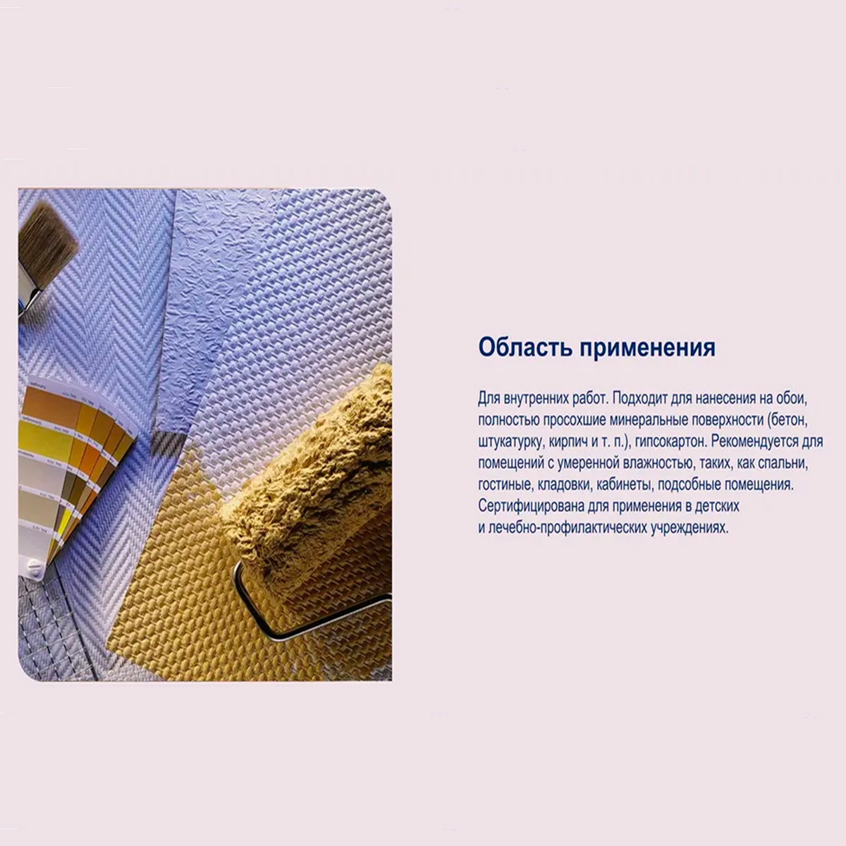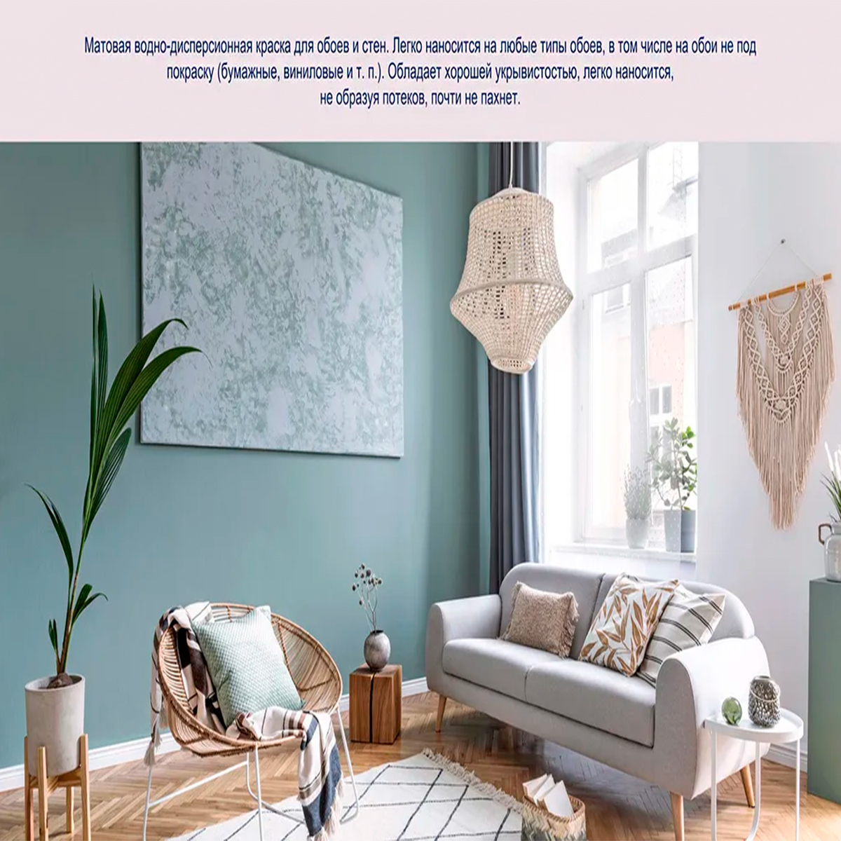 Матовая водно-дисперсионная краска для обоев и стен. Легко наносится на любые типы обоев, в том числе на обои не под покраску (бумажные, виниловые и т. п.). Обладает хорошей укрывистостью, легко наносится и почти не пахнет.Время высыхания: 2–4 часаОснова: Дисперсия стиролакрилового сополимераРасход: До 12 м2/лСтепень блеска: Матовая.