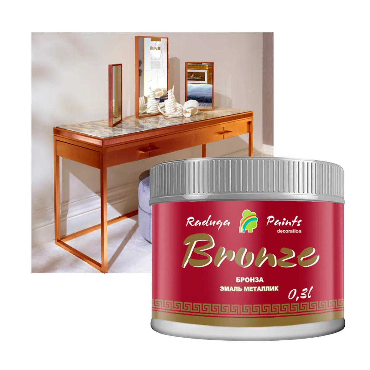 Естественный бронзовый оттенок, подчеркивающий дизайн пространства. Для декорирования архитектурных элементов, помещений и предметов интерьера. Эмаль акриловая, водоразбавимая, универсальная. Подходит для дерева, керамики, металла, камня, а также для обоев, ткани, кожи так далее. Не токсична, пожаровзрывобезопасна. Можно очищать влажной уборкой. На выбор три готовых цвета: Gold, Silver, Bronze (золото, серебро, бронза).Преимущества:Не токсична, пожаровзрывобезопасна.Назначение:Водоразбавимая акриловая эмаль придает поверхностям эффект "под бронзу”. Рекомендуется для декорирования архитектурных элементов, помещений и предметов интерьера. Эмаль легко наносится на дерево, ДВП, ДСП, полистирол, ПВХ, керамику, металл, каменную кладку, обои всех видов, ткани, кожу т. д. Для внутренних работ.Применение:Наносить на сухие, тщательно очищенные и обезжиренные поверхности. Перед применением эмаль тщательно перемешать. Наносить кистью, валиком, краскопультом при температуре поверхности и окружающей среды не ниже +15°С. Каждый последующий слой наносить через 2 часа. Все заявленные свойства эмаль приобретает после 7 суток с момента высыхания.Меры предосторожности:Во время проведения работ и после их окончания, проветривать помещение. При попадании в глаза промыть большим количеством воды. Хранить в плотно закрытой таре. Беречь от детей.Расход: 6-8 м²/л зависит от вида поверхности.Высыхание: 2 часа при t+20°С и влажности 65%.Состав: Вода, алюминиевый пигмент, акриловая дисперсия, целевые добавки.Гарантийный срок: 24 месяца со дня производства.Хранение: Хранить и транспортировать в плотно закрытой таре при температуре не ниже +5⁰С.Объем: 0,3 л.