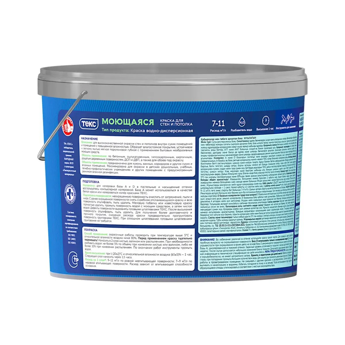 Краска водно-дисперсионная для высококачественной окраски стен и потолков внутри сухих помещений и помещений с повышенной влажностью. Образует влагостойкое покрытие, устойчивое к легкому мытью мягкой поролоновой губкой с применением бытовых неабразивных моющих средств. Применяется по бетонным, оштукатуренным, гипсокартонным, кирпичным, дощатым деревянным поверхностям, ДСП и ДВП, а также для обоев под окраску. Предназначена для кухонь, ванных, коридоров и других сухих и влажных помещений. Рекомендована для окраски в детских дошкольных, учебных, лечебнопрофилактических учреждениях и других помещениях с предусмотренным режимом влажной дезинфекции. Для колеровки базы А и D в пастельные и насыщенные оттенки воспользуйтесь компьютерной колеровкой. Базу D использовать только в колерованном виде! Для лучшей укрывистости при окрашивании в яркие цвета на основе базы D рекомендуется предварительно нанести слой краски базы А, заколерованной в похожий оттенок. Во избежание различий в оттенке используйте краску одной партии. Для проверки цвета сделайте пробную выкраску на окрашиваемой поверхности.Технические характеристики :Срок годности (с даты изготовления): 24 месТип: акриловая (водно-дисперсионная)Вид тары: ведроОбъем: 9 лВес нетто: 14 кгПалитра: прозрачныйВозможность колеровки: даБез запаха: даТип обоев: под покраскуЦвет: прозрачныйБазис : база 3 (B3/C/BC/KC/D/LC/MRC)Система колеровки: по каталогу ТЕКССтепень блеска: глубокоматовыйПлотность: 1.55 кг/лРасход: 0.14-0.25 л/м²Разбавитель: водаОснования: ЦСП/ФСП/ОСП/бетон/кирпич/минеральные основанияТемпература основания: 5 °СMin температура эксплуатации : -50 °СMax температура эксплуатации : 60 °ССпособ нанесения: кисть/валик/краскораспылительВремя полного высыхания: 1.5 чМоющаяся: даВлагостойкость: даФактурная: нетБыстросохнущая: даИзносостойкая: даДля пластика: нетДля кирпича: даДля бетона: даДля металла: нетДля дерева: даДля камня: даДля помещений с повышенной влажностью: нетДля медицинских учреждений: даДля детских учреждений: даПреимущества :Краска удобно наносится, образует глубокоматовое паропроницаемое (дышащее) покрытие, выдерживающее влажную уборку Колеруется в пастельные и насыщенные тона Моется влажной губкой Рекомендована для детских и лечебных учрежденийДля колеровки воспользуйтесь компьютерной колеровкой Текс или заколеруйте самостоятельно колер красками Профи Текс