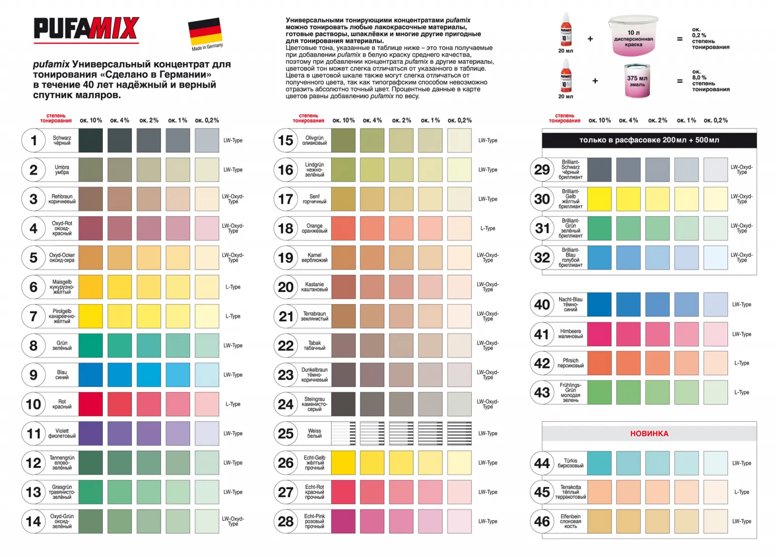 Универсальный концентрат для тонирования Pufas Pufamix 20 млВысокоэффективный концентрат-колер на основе органических и неорганических пигментов.Используется для добавления в различную лакокрасочную продукцию, с целью придания, ей желаемого цвета и оттенка. Концентрат имеет широкий спектр цветовой гаммы. На данный момент доступны 39 цветовых тонов.Концентрат очень универсален, и может добавляться в любую лакокрасочную продукцию, но в различных пропорциях:Водные дисперсии максимум 10 %Лаки и краски с растворителем максимум 8 %Растворы максимум 10 %Акриловые лаки и краски максимум 6 %Грунтовки по дереву, лазури, восковые составы максимум 5 %Силикатные краски максимум 3%.- большая цветовая гамма- для внутренних и наружных работ- универсальный- морозостойкий- срок хранения не ограниченТехнические характеристики:Сырьевая основа: органические и неорганические пигментыПлотность: 1,3 – 1,8 г/мл (в зависимости от цвета)Показатель pH: около 7,0Упаковка: флакон 20 млПрименениеПеред использованием флакон хорошо встряхнуть. Пуфамикс добавить в предназначенный для тонирования материал и хорошо перемешать до образования однородной консистенции. Для тонирования лаков рекомендуется применять смешивающее устройство.Перед смешиванием с материалами на основе растворителей, провести пробу на совместимость.Следует обращать внимание на типы концентратов:Pufamix тип L - светостойкий, только для внутренних работ.Pufamix типы LW и LW-оксиды – свето- и погодоустойчивые для внутренних и наружных работ.Для растворов и материалов с минеральными связующими, защитных и связующих красок, фасадных красок с растворителем, силикатных материалов, материалов на основе смолы силикона, использовать только цветовые тона Pufamix LW-оксид.ХранениеЁмкости хранить в прохладном месте и плотно закрытыми.Срок годности в хорошо закрытой ёмкости не ограничен. Продукт морозостойкий. Временные замерзания не вредят качеству концентратов.