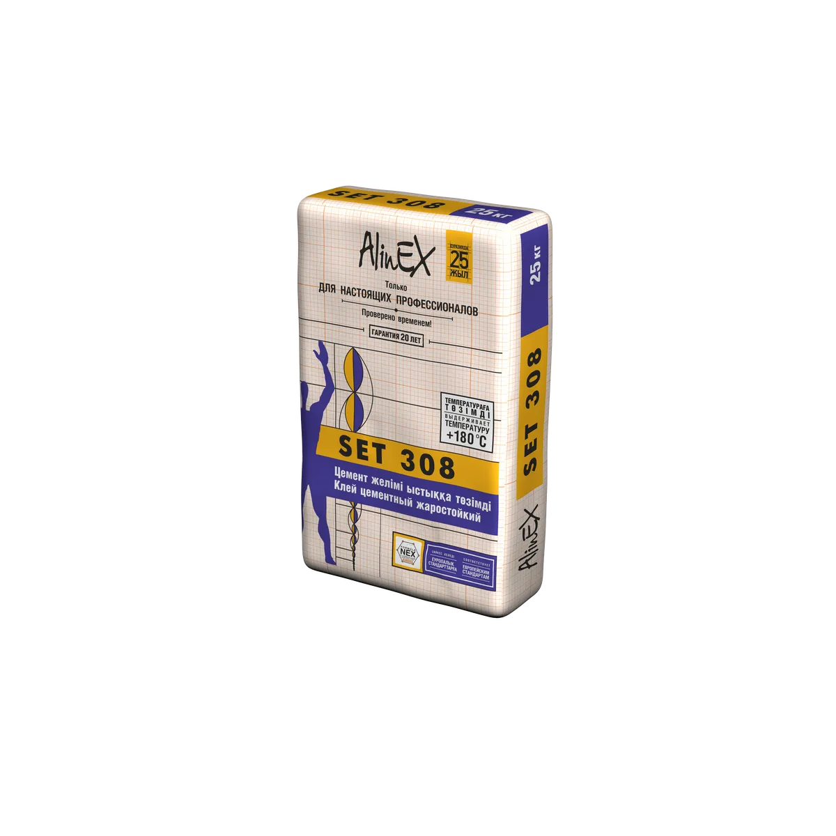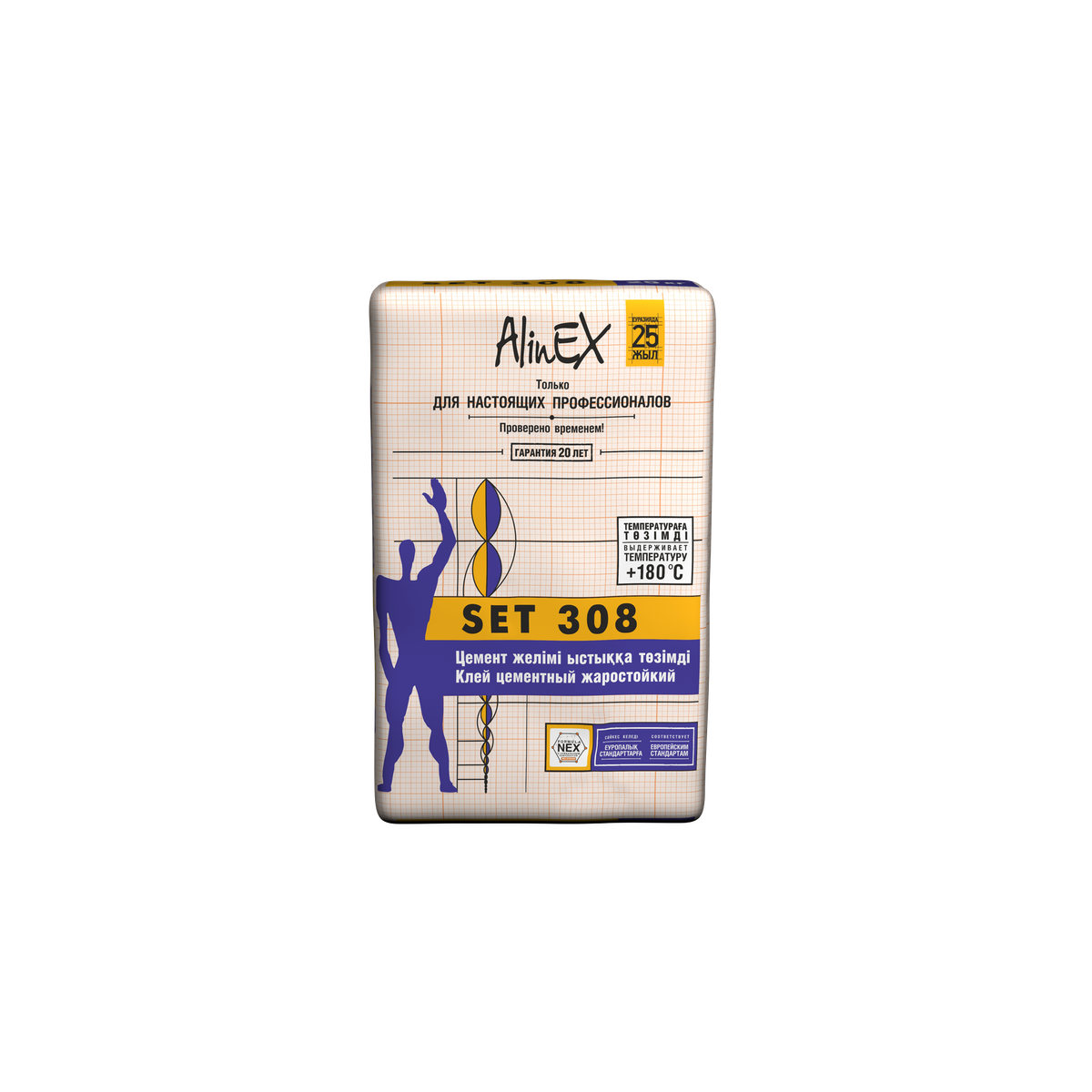 Область примененияПредназначается для облицовки каминов, печей, полов с подогревом керамической, мраморной, каменной плиткой, а также пригоден для проведения любых облицовочных работ на бетонных, пенобетонных, кирпичных, деревянных и других минеральных основаниях стен и стяжек в сухих и влажных помещениях.Упаковка и хранениеБумажные мешки по 25 кг. Не допускать попадания влаги. Вскрытые мешки использовать в первую очередь. Гарантийный срок хранения в заводской упаковке в сухом виде составляет минимум 9 месяцев. Хранить при температуре -30 ˚С +40˚С и относительной влажности до 80%.Подготовка основыПлитка укладывается на хорошо выровненную поверхность. Основание должно быть твердым, ровным и тщательно очищенным от пыли, грязи, извести, масел, жиров, старой рыхлой штукатурки, остатков красок. Невыровненные площади для облицовки каминов и печей рекомендуется откорректировать смесью АlinEX "SET 308". Сильновпитывающую поверхность необходимо обработать специальной грунтовкой АlinEX "PRIMER".Приготовление раствораСухую смесь высыпать в чистую воду, постоянно перемешивая вручную или с помощью электродрели, до получения однородной массы. Соотношение при смешивании: на 25 кг сухой смеси необходимо 5,5-5,75 л. воды. Смесь пригодна к применению через 5 минут. Приготовленная порция должна быть использована в течение 1,5-2 часов.