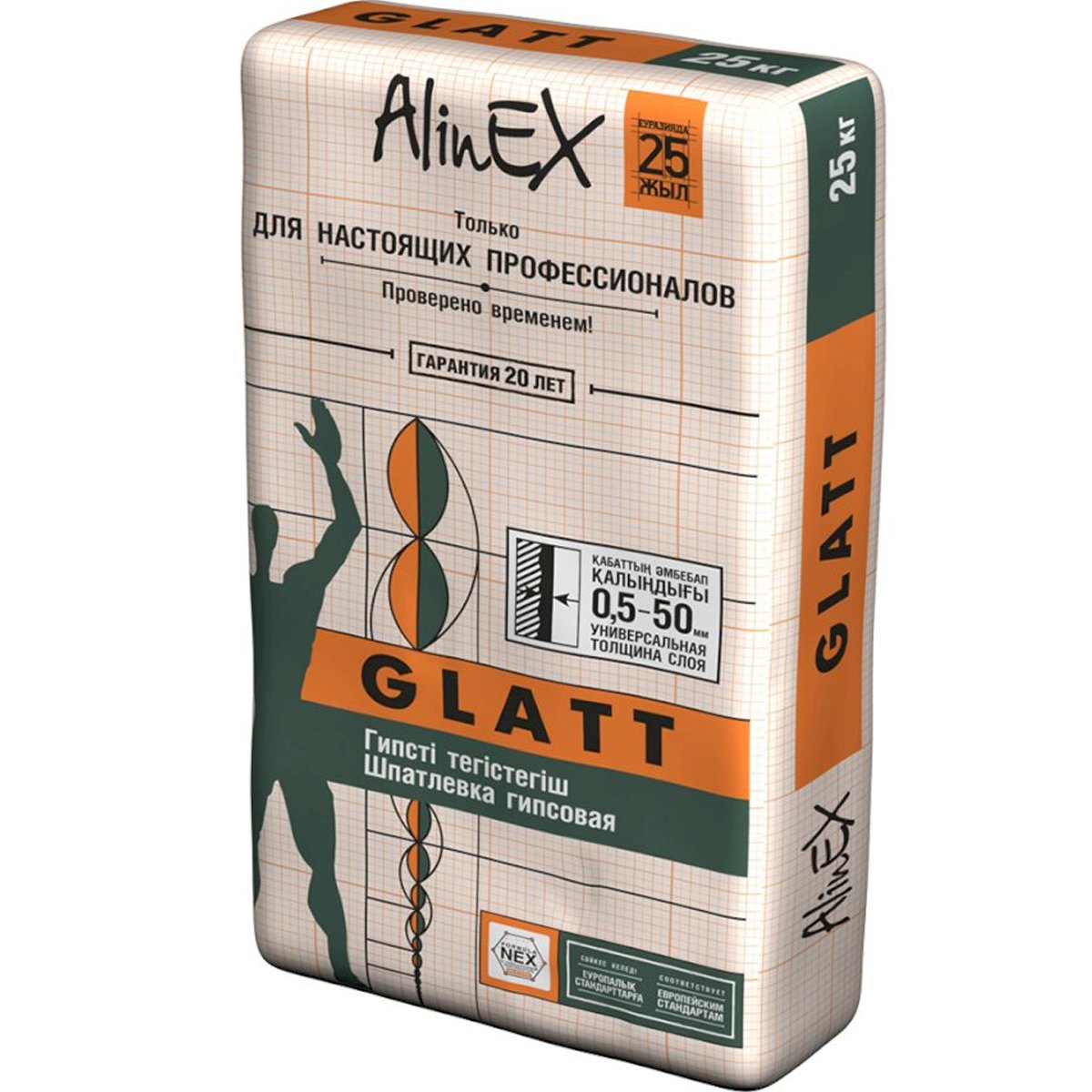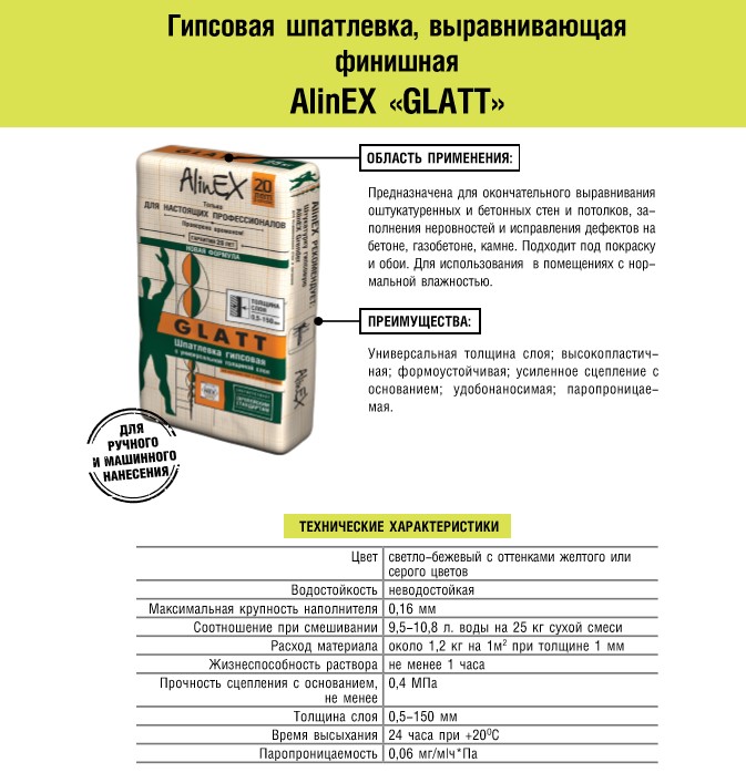 Предназначена для окончательного выравнивания оштукатуренных и бетонных стен и потолков, заполнения неровностей и исправления дефектов на бетоне, газобетоне, камне. Для использования в помещениях с нормальной влажностью.Упаковка и хранениеБумажные мешки по 25 кг. Не допускать попадания влаги. Вскрытые мешки использовать в первую очередь. Гарантийный срок хранения в заводской упаковке в сухом виде составляет минимум 6 месяцев. Хранить при температуре -30 ˚С +40˚С и относительной влажности до 80%.Подготовка основыОснование должно быть сухим, твердым, тщательно очищенным от пыли, извести, масел, жиров, старой рыхлой штукатурки, остатков старых обоев и краски. Для улучшения адгезии и с целью снижения водопоглощения поверхность должна быть обработана глубокопроникающей грунтовкой “Алинэкс ПРАЙМЕР”.Приготовление раствораСухую смесь высыпать в подготовленную емкость с чистой водой комнатной температуры, тщательно перемешать с применением электродрели-миксера до получения однородной массы без комков. Смесь готова к использованию через 2-3 минуты. Соотношение при смешивании: на мешок сухой смеси весом 25 кг требуется 9,5-10,8 л воды. Перед применением раствор необходимо еще раз тщательно перемешать с использованием электродрели-миксера. Приготовленный состав должен быть использован в течение 1 часа.Способ примененияШпатлевка наносится при помощи двух шпателей. Для выравнивания используются широкие шпатели с длиной рабочей поверхности примерно 30 или 70 см. Для нанесения шпатлевки на инструмент используются маленькие шпатели длиной 7 или 10 см. Мазки наносятся перпендикулярно друг к другу. Излишки шпатлевки удаляются с инструмента, затем повторно используются. Рекомендуемая минимальная толщина нанесения – 1 мм, максимальная – 30 мм.При выравнивании в несколько слоев перед нанесением каждого последующего слоя необходимо убедиться в том, что предыдущий слой полностью высох. Высохшую поверхность шлифуют абразивным материалом №0. Время высыхания 24 часа при температуре +20º С.Окончательная обработкаВысохшую и обработанную абразивным материалом поверхность можно окрасить или оклеить легкими обоями. Толщина слоя шпатлевки для оклейки и окраски должна быть не менее 1 мм.