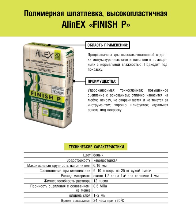 Предназначена для высококачественной отделки оштукатуренных стен и потолков в помещениях с нормальной влажностью.Упаковка и хранениеБумажные мешки по 25 кг. Не допускать попадания влаги. Вскрытые мешки использовать в первую очередь. Гарантийный срок хранения в заводской упаковке в сухом виде составляет минимум 12 месяцев. Хранить при температуре -30 ˚С +40˚С и относительной влажности до 80%.Подготовка основыОснование должно быть сухим, твердым, тщательно очищенным от пыли, извести, масел, жиров, старой рыхлой штукатурки, остатков старых обоев и краски. Полимерная шпатлевка "Алинэкс ФИНИШ П" пригодна для нанесения на основания, обработанные цементными и гипсовыми штукатурками, а также гипсовыми шпатлевками “Алинэкс”.Для улучшения адгезии и с целью снижения водопоглощения поверхность должна быть обработана глубокопроникающей грунтовкой “Алинэкс ПРАЙМЕР”.Приготовление раствораСухую смесь высыпать в емкость с чистой водой комнатной температуры, тщательно перемешать с применением электродрели-миксера до получения однородной массы без комков, дать раствору отстояться 3-5 минут и снова перемешать, после чего смесь готова к применению. Соотношение при смешивании: на мешок сухой смеси весом 25 кг требуется 9-10 л. воды. Передозировка воды ведет к снижению прочностных качеств готовой поверхности. Приготовленный состав должен быть использован в течение 8 часов.Способ примененияШпатлевка наносится при помощи двух шпателей. Для выравнивания используются широкие шпатели с длиной рабочей поверхности примерно 30 или 70 см. Для нанесения шпатлевки на инструмент используются маленькие шпатели рабочей поверхностью 7 или 10 см. Мазки наносятся перпендикулярно друг к другу. Излишки шпатлевки удаляются с инструмента, затем повторно используются. При выравнивании в несколько слоев перед нанесением каждого последующего слоя необходимо убедиться в том, что предыдущий слой полностью высох. Высохшую поверхность шлифуют абразивным материалом №0. Время высыхания 24 часа при температуре +20º С.Окончательная обработкаВысохшую и обработанную абразивным материалом поверхность рекомендуется окрасить воднодисперсионными красками Alina Paint.