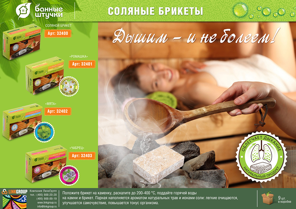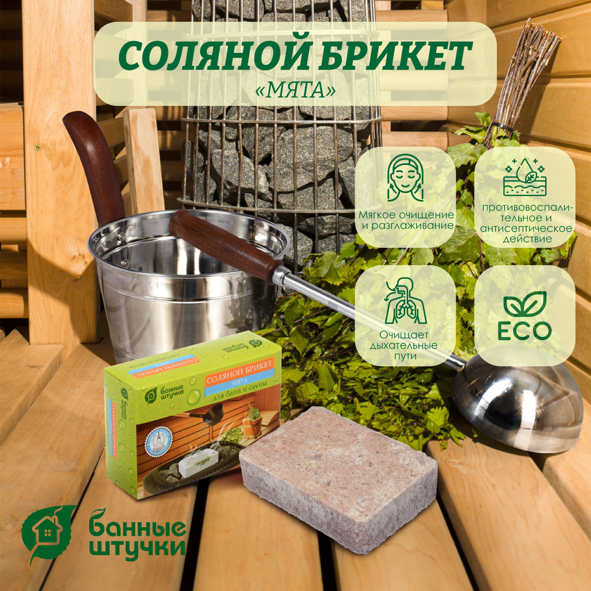 Соль осаждается тонким слоем на коже, обеспечивая мягкое очищение и разглаживание. Соляные пары очищают дыхательные пути. Мята обладает тонизирующим, противовоспалительным и антисептическим действием. Если регулярно дышать соляным паром, то улучшается самочувствие, повышается тонус организма. хватает примерно до 10 посещений сауны, бани.Способ применения: Брикет необходимо положить на печь среди камней и раскалить до температуры 200-400 С. Затем на камни и брикет поддать горячей воды, благодаря чему парная наполнится травяным ароматом и ионами соли.Предназначение: Для использования в бане и сауне.Состав: Природная каменная соль, измельченные листья мяты.Срок годности: Не ограничен.Вес, кг: 1.3