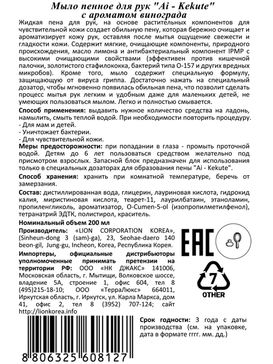 Жидкая пена для рук Lion на основе растительных компонентов с приятным ароматом винограда создает обильную пену, которая бережно очищает и ароматизирует кожу рук, оставляя после мытья ощущение свежести и гладкости кожи. Содержит мягкие, очищающие компоненты.