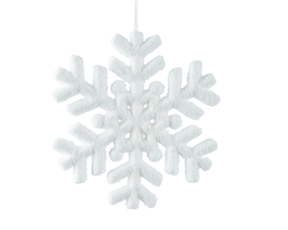 Украшение выполнено в белом цвете и передаёт форму классической снежинки с красивой прорезной структурой. Благодаря аккуратной детализации и аккуратной отделке оно выглядит эффектно как самостоятельно, так и в сочетании с другими праздничными элементами. Небольшой подвес позволяет легко разместить украшение на ёлке, люстре, стене или в оконном декоре.