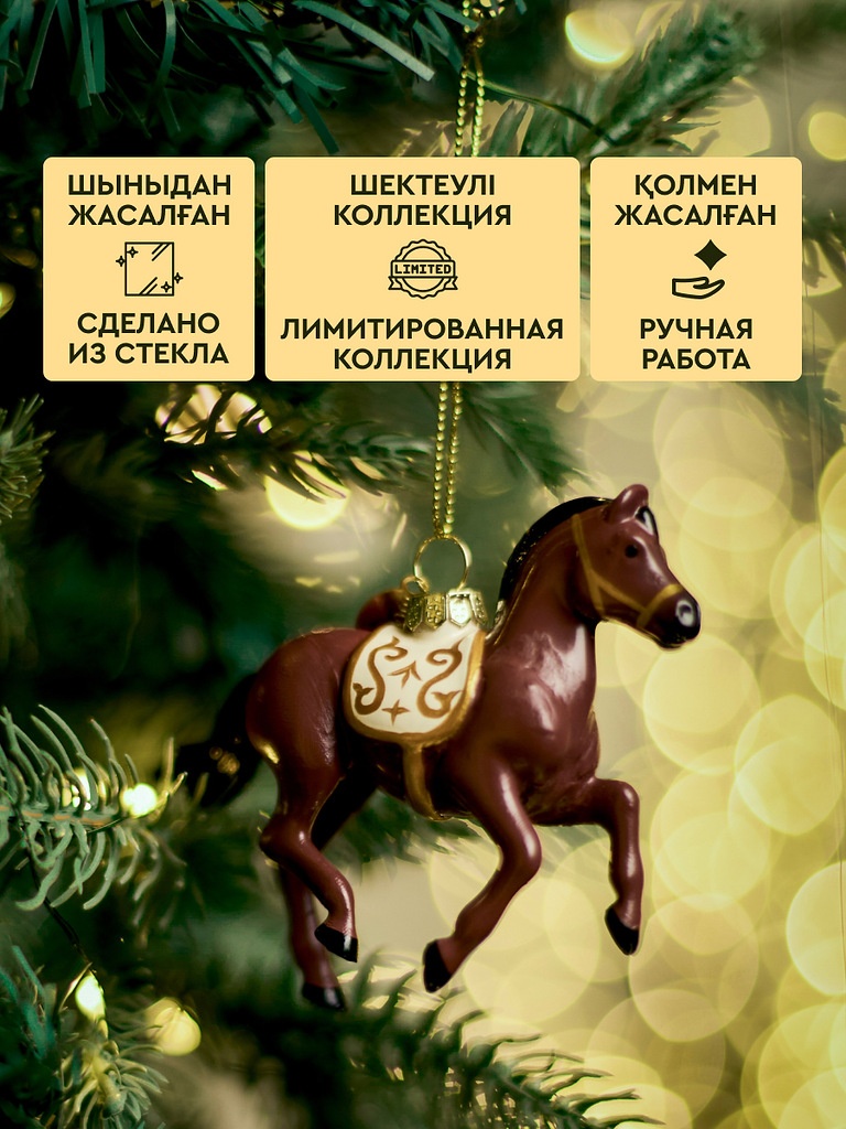 Стильное подвесное украшение MEREKE в виде лошади выполнено из стекла и декорировано вручную, что делает каждое изделие уникальным. Лошадь символизирует верность и стойкость, добавляя глубину и смысл праздничному декору.