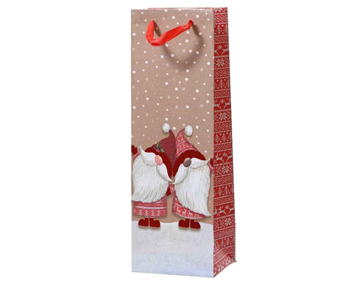 На пакете изображены праздничные гномы в зимней тематике, что делает его особенно подходящим для новогодних и зимних подарков. Изготовлен из прочного картона с ярким принтом и аккуратной отделкой, пакет обеспечивает надёжную упаковку содержимого и удобство переноса.