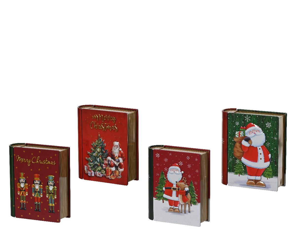 Жестяная коробка для хранения в форме книги поможет аккуратно организовать ваши любимые рождественские сувениры, мелкие украшения или памятные предметы. Она защищает содержимое от пыли и повреждений, придавая интерьеру праздничное очарование.