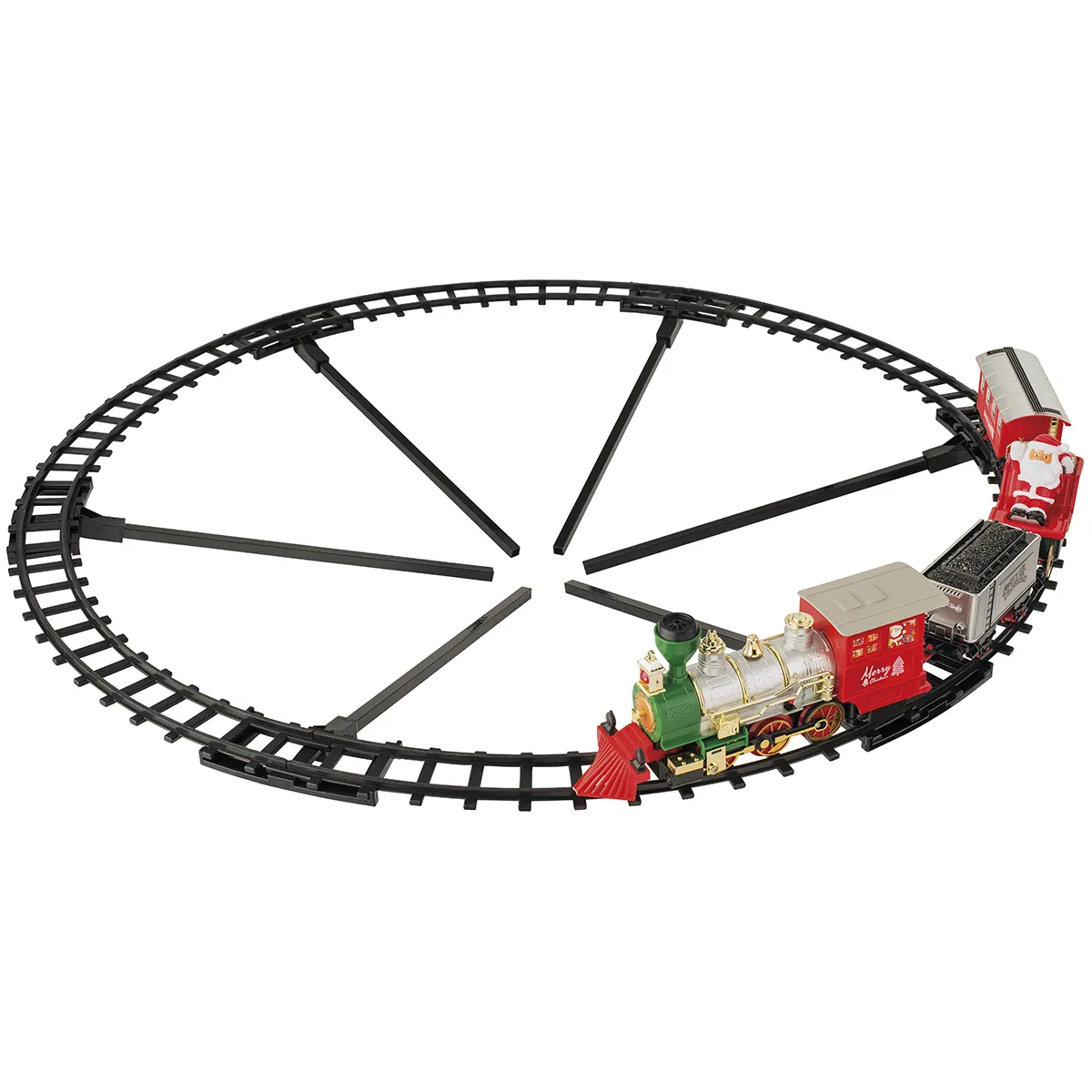 Зимние праздники – самые любимые и долгожданные и это не удивительно, ведь Рождество и Новый Год – это всегда ожидание чего-то невероятного, сказочного и волшебного и для того, что бы это волшебство не рассеялось в ежедневных заботах и хлопотах стоит уделить особое внимание украшению интерьера. Поезд вокруг рождественской елки это настоящее волшебство. И что бы волшебство стало реальностью, Вам всего лишь нужно поместить эту декорацию на свою новогоднюю елку. Когда вы включите его, он будет ездить по кругу и играть веселую рождественскую музыку. Круглые рельсы поезда имеют диаметр 274 сантиметра. Сам поезд состоит из локомотива и 3 вагонов. Поезд работает от 4 батареек АА (не входят в комплект) и поэтому не зависит от розетки.