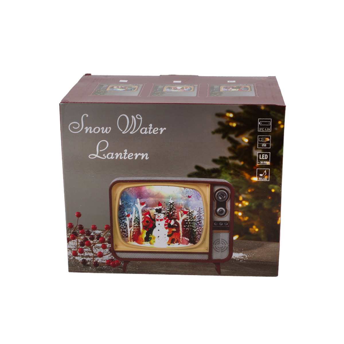 Телевизор-декорация превращает привычное украшение в маленький кинотеатр, где всегда идёт добрая зимняя история. Внутри уютная новогодняя сцена с LED-подсветкой и блестящим снегопадом, который непрерывно кружится, создавая ощущение живой сказки.